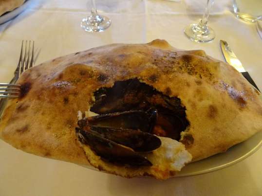 An dieser Stelle möchten wir eine Empfehlung weitergeben, die auch wir bekommen haben. Ein besonderes Gericht bietet die Trattoria „Il Gattopardo“, die erste Pizzeria auf der linken Seite an. Das Gericht nennt sich „Zuppa di Cozze in Crosta“ und kostet 13,-€. Auf der Tafel vor der Trattoria ist das Gericht abgebildet. Neugierig, was uns erwartet, kehrten wir ein und bestellten „Zuppa di Cozze in Crosta“ und einen halben Liter regionalen Wein. Nach kurzer Wartezeit servierte die Kellnerin eine Edelstahlplatte mit einer Haube aus gebackenem Pizzateig, sozusagen ein Überraschungspaket. Mit einem scharfen Messer schnitten wir ein Loch in die Pizzateigplatte und zum Vorschein kamen große Miesmuscheln in Tomatensoße. Es ist ein Gericht, welches mit den Fingern gegessen werden möchte. Für Nicht-Muschelesser sei gesagt, dass man mit den Schalen der ersten Muschel, die man gegessen hat, die weiteren Muscheln isst. Aus dem Pizzateig werden immer neue Stücke gebrochen, mit denen die Tomatensoße aufgetunkt wird. Es muss aber noch genug Tomatensoße übrig bleiben, wenn die Muscheln gegessen sind, denn nun kommt die zweite Hälfte des Gerichts, die Spaghetti. Die werden in die Tomatensoße gegeben und man hat ein zweites Gericht in einem. Wir fanden das eine tolle Idee und es schmeckt hervorragend. Es ist ein besonderes Esserlebnis.