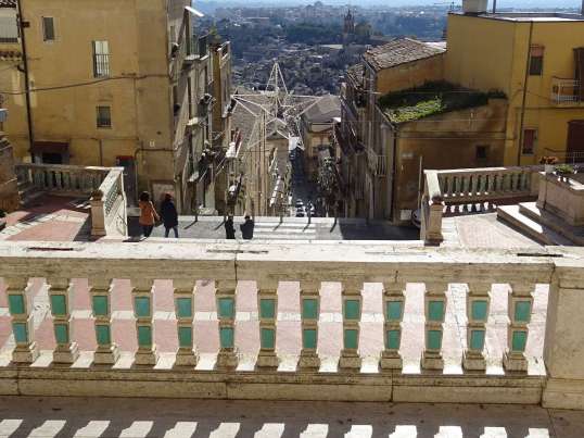 Um dorthin zu gelangen, steigt man die berühmte Treppe von Caltagirone, die Scala Santa Maria del Monte, herunter. Das Besondere an dieser Treppe? – Jede Stirnseite der 142 Stufen wurde mit handgemalten Keramikfliesen belegt, die immer andere Motive zeigen. Keine zwei Stufen weisen das gleiche Motiv auf. Die Treppe wurde 1606 gebaut, aber erst 1954/55 bekam sie ihr heutiges Aussehen.