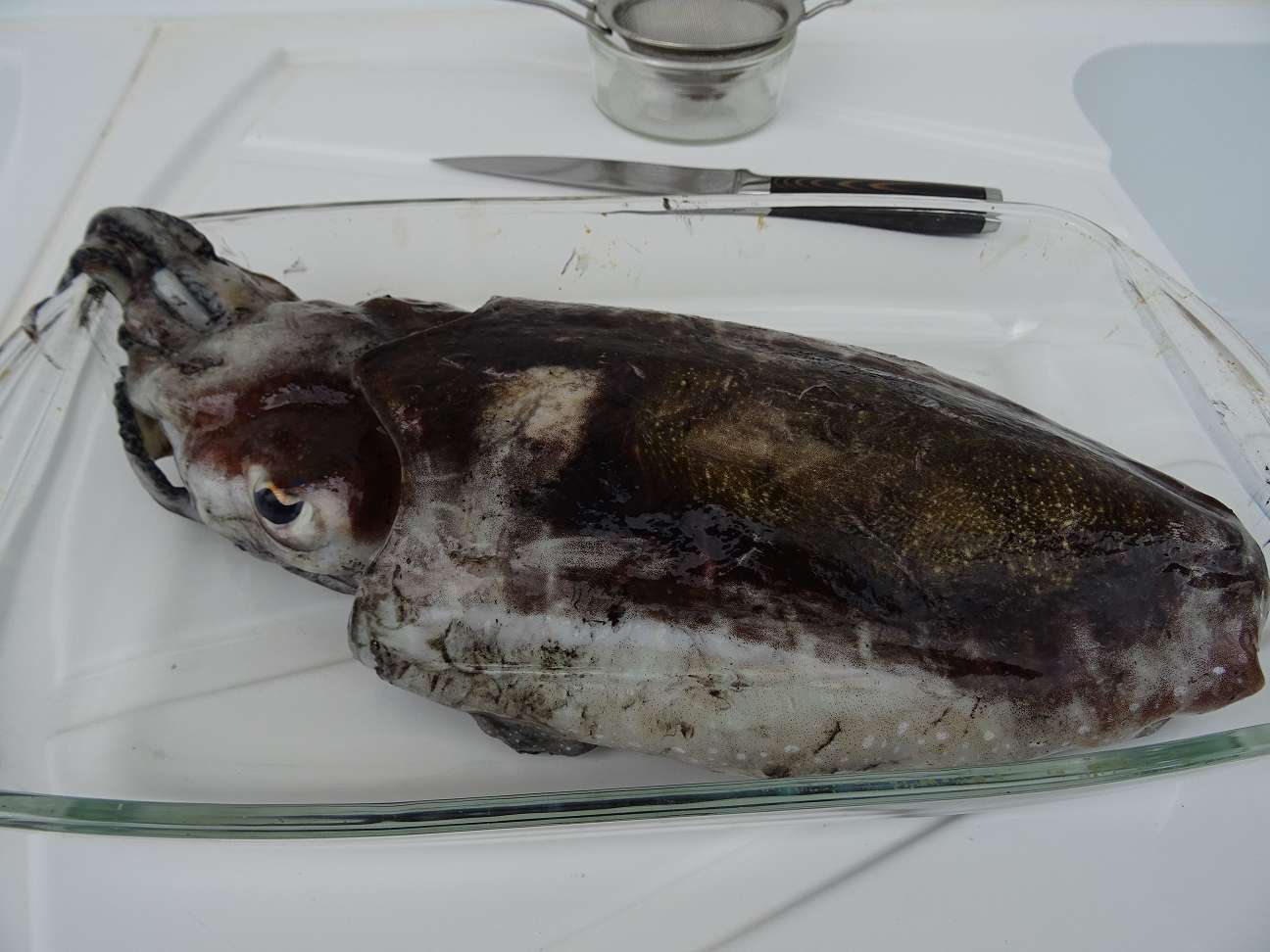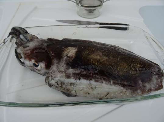 Es war unsere erste Sepia, die ein Gewicht von fast 1,2kg hatte, also recht groß. Im Internet sagt man, dass sich die Tintenblase zwischen den Tentakeln befindet. Das Heraustrennen des Kopfes mit den Tentakeln war schon eine schwierige Aufgabe. Um die großen Augen herauszubekommen, musste ich mit dem Messer herangehen. Das Entfernen des Schnabels war dann leichter. Als ich bei der Arbeit war, kam der benachbarte Camper. Als er sah, was ich dort veranstaltete, wünschte er mir ganz höhnisch „viel Spaß“.