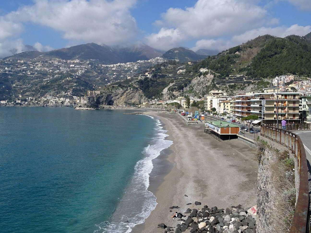 Auf dem Rückweg nach Salerno ist die Bergkette der Apenninen zu sehen, die sich hinter der Küste in einigem Abstand erhebt. Einige der Berggipfel sind immer noch schneebedeckt, so ab 1900 Metern Höhe.