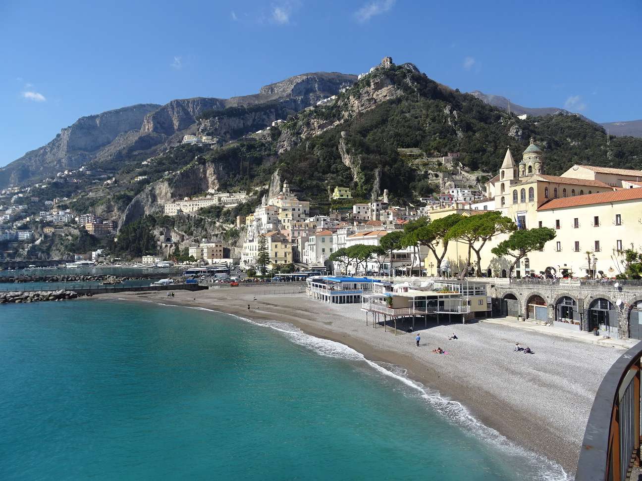 Nun spazierten wir ca. hundert Meter an der Küste zurück nach Amalfi, das wunderschön liegt und mit verschiedenen baulichen Details für Neugier bei den Besuchern sorgt. Der Stadtstrand liegt jetzt verlassen, daran schließt sich ein kleiner Hafen an, von dem Boote starten, entweder an der Amalfiküste entlang oder gleich zur berühmten Insel Capri. Zu dieser Jahreszeit gibt es nur drei Abfahrtszeiten zur Insel.