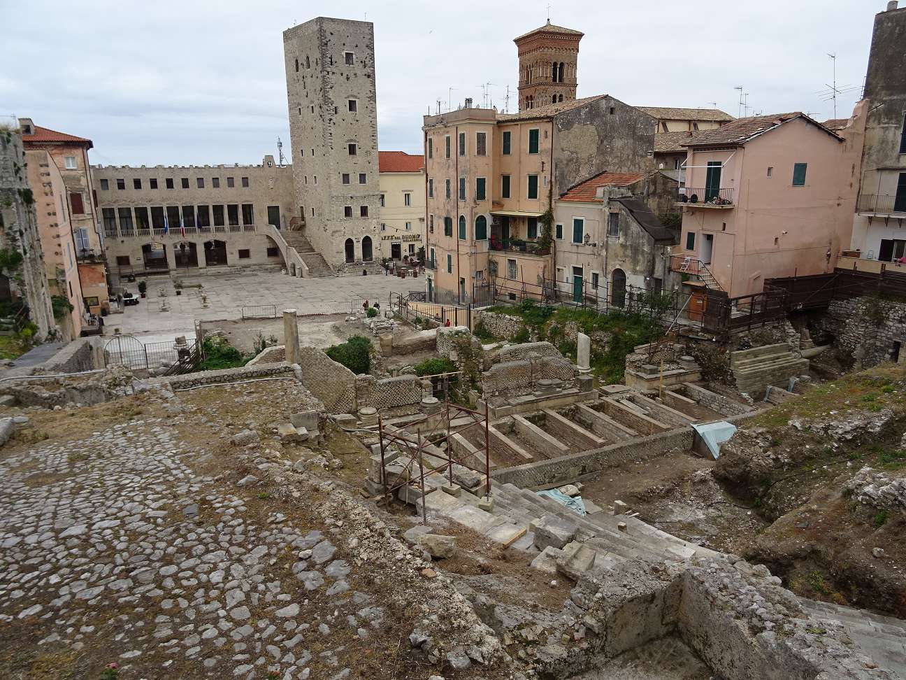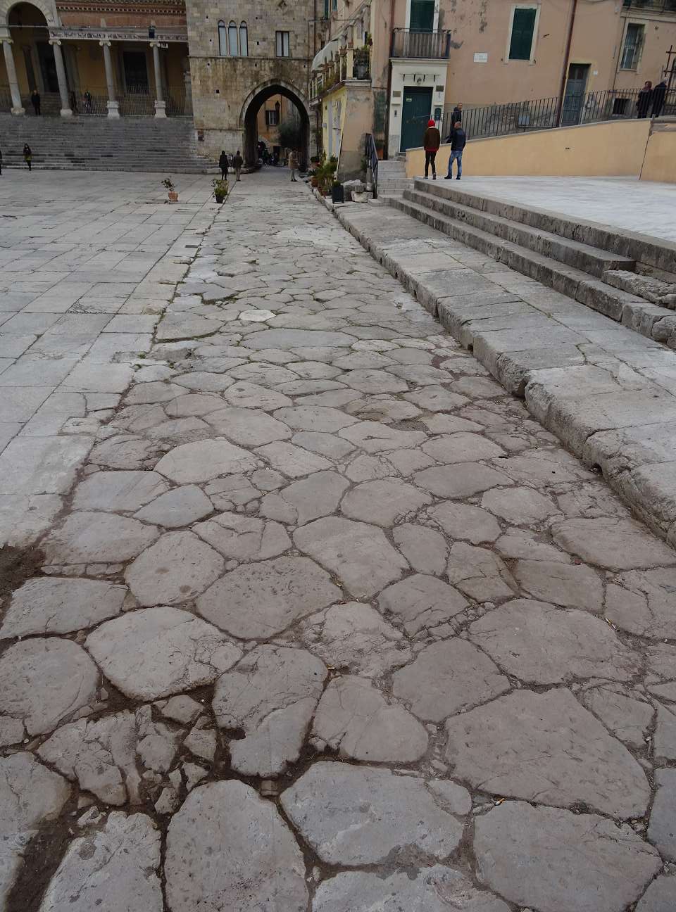 Es gibt mehrere Teilabschnitte, die noch heute im Originalzustand besichtigt werden können. Dazu gehört das durch die historische Altstadt Terracinas, oben auf einem Hügel. Der Platz vor der Kathedrale war einst das Aemilius Forum mit einem Theater. Daran schloss sich im Südosten ein großes Tor an, der Vier-Gesichter-Bogen. Im Mittelalter überbaute man die römischen Relikte, die nach dem Bombardement 1943 wieder zum Vorschein kamen. Aurus Aemilius war der lokale Magistrat der Stadt Terracina, der den Bau des Platzes in Auftrag gab. Das war um den Beginn unserer Zeitrechnung.