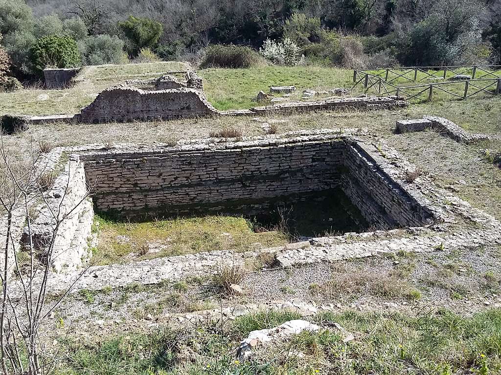 Rechter Hand, nachdem man sich am nördlichen Forum umgesehen hat, sind die Thermen zu finden. Ein großes Wasserbecken ist noch komplett erhalten.