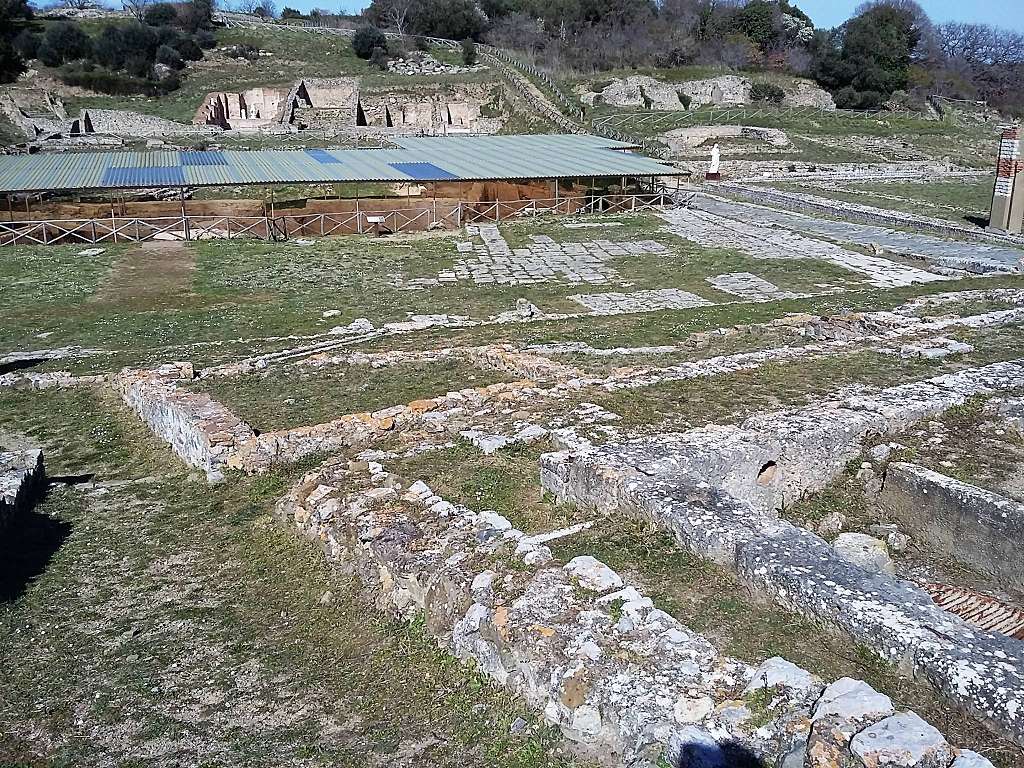 Vom oberen Ende des Wohnhauses aus hat man einen schönen Blick über fast die gesamte Ausgrabungsstätte, den südlichen Hügel hinunter in das Tal, wo sich das Forum befand, und auf der anderen, der nördlichen Seite wieder hinauf.