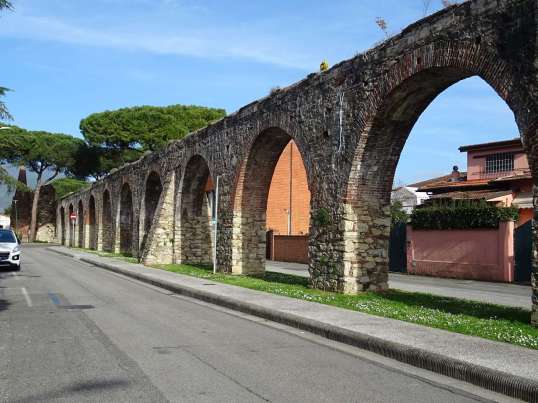 Wir haben unser Womo auf dem Stellplatz Camperisti Pisani stehen. Der Platz befindet sich direkt am römischen Aquädukt, der immer noch bis an die Stadtmauer von Pisa führt, mit wenigen Unterbrechungen. Hier sehen wir zum ersten Mal Bauwerke, die am Aquädukt lehnen, die wahrscheinlich als Kontroll- und Pumpbauwerke dienten. Man braucht also immer nur der alten Wasserleitung folgen und kommt genau in die Altstadt.