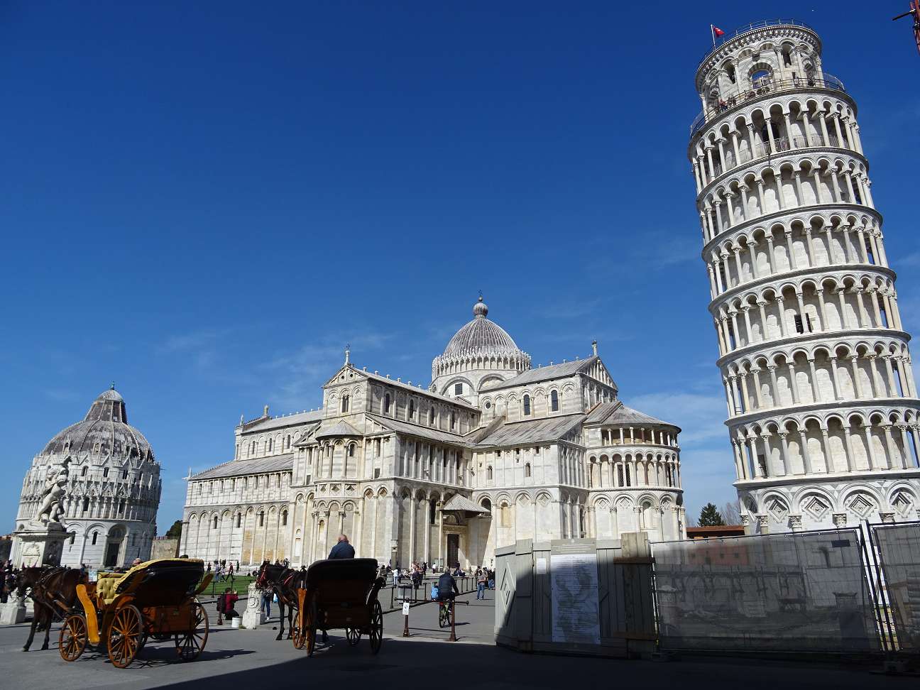 Jeder, der Pisa besucht, steuert die Piazza del Duomo an. Der Platz wird auch Piazza die Miracoli genannt. Hier sind die berühmtesten Bauwerke, allesamt aus weißem Marmor, zu finden: natürlich der Schiefe Turm von Pisa, die Kathedrale und das Baptisterium, das größte in Italien. Der Puttenbrunnen am Platz ist ebenfalls aus weißem Marmor. Um den Platz herum gruppieren sich mehrere Museen und der Friedhof. Ein Teil des Domplatzes wird von der Stadtmauer und mehreren Stadttoren abgeschlossen.