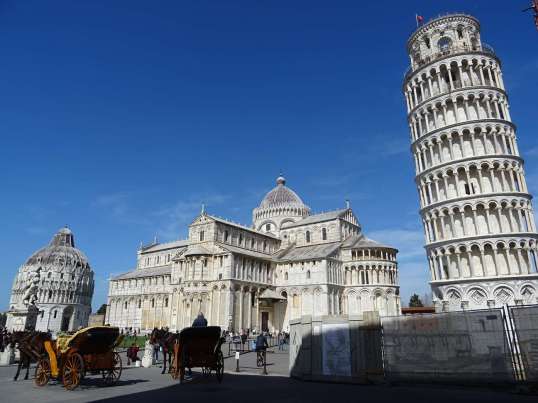 Das Highlight ist und bleibt in jedem Fall der Schiefe Turm von Pisa. Er ist der Glockenturm der Kathedrale. Im Sommer 1173 legte man den Grundstein für den Glockenturm und baute die ersten drei Etagen. Schon während dieser Bauzeit begann sich der Turm zu neigen. Irgendwann baute man dann die restlichen vier Etagen darauf, in einem etwas anderen Winkel, bei dem man versuchte, die Schieflage auszugleichen. Wenn man genau hinsieht, sind die zwei verschiedenen Winkel zu erkennen. Erst viel später setzte man den Raum mit den Glocken darauf.