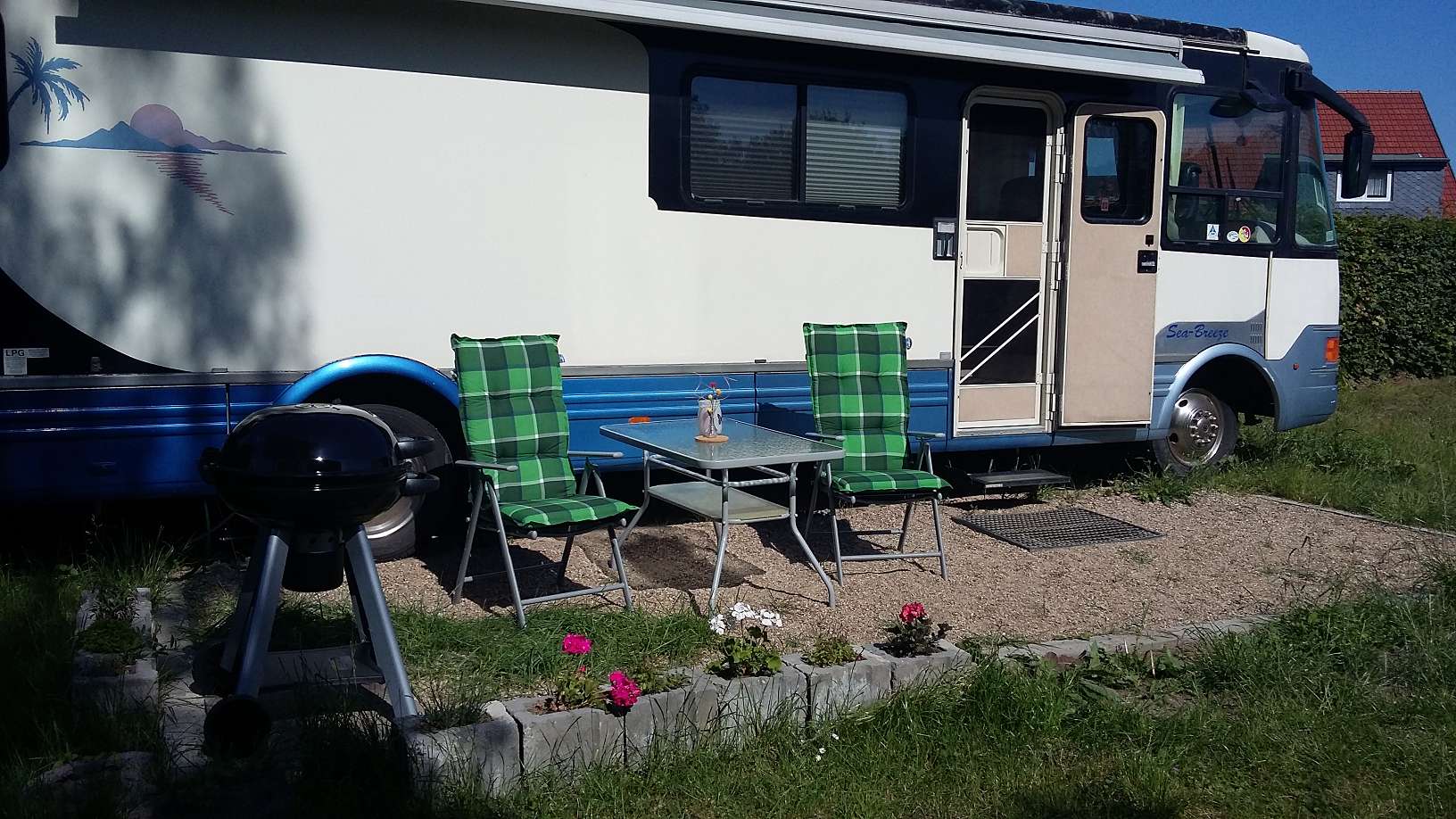 Wir durften viele liebe Gäste begrüßen und hatten in den meisten Fällen viel Spaß zusammen. Wir freuen uns, dass wir so viel Zuspruch gefunden haben. Anfangs gab es zwar noch ein paar wenige Kinderkrankheiten, aber die konnten beseitig werden. Die meisten Gäste fühlten sich in dem geräumigen und gut ausgestatteten Wohnmobil wohl. Viele Möglichkeiten der Freizeitgestaltung bieten die nahe gelegene Stadt und die grüne Umgebung. Nach all den Unternehmungen bietet die kleine Terrasse vor dem Wohnmobil eine kleine Auszeit in Ruhe mit Blick ins Grüne.