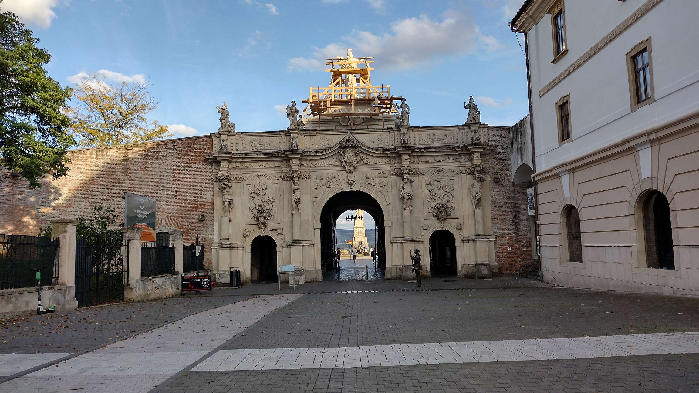 Wir setzten unseren Spaziergang fort, Nun trafen wir auf die horizontale Achse von Karlsburg und sahen die zwei sich gegenüberstehenden Stadttore. Es soll einmal sechs davon gegeben haben. Wir hielten auf das Dritte Stadttor zu, welches als Triumphbogen gestaltet wurde. Durch dies hindurch sieht man die Stele, die die Geburtsstunde Rumäniens symbolisiert. Man erreicht sie, indem man Karlsburg über eine Zugbrücke verlässt.