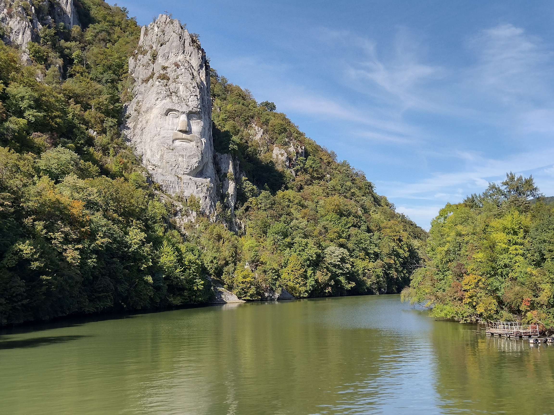 Nach einigem Fragen fanden wir die Skulptur im Felsen, die auf vielen Bildern der Gegend zu sehen ist. Das „Eiserne Tor“ erstreckt sich zwischen Orsova und Dragova. Die Straße windet sich entlang den senkrechten Felsen, die das Donauufer begrenzen. Von Osten kommend führt kurz vor dem Kloster Mraconia eine Brücke über den Golf Mraconia. Von genau dort ist die Skulptur des letztes Daker-Königs zu sehen. Es ist laut Wikipedia die höchste Steinskulptur Europas und die zweitgrößte der Welt. Das Flachrelief ist 55m hoch.