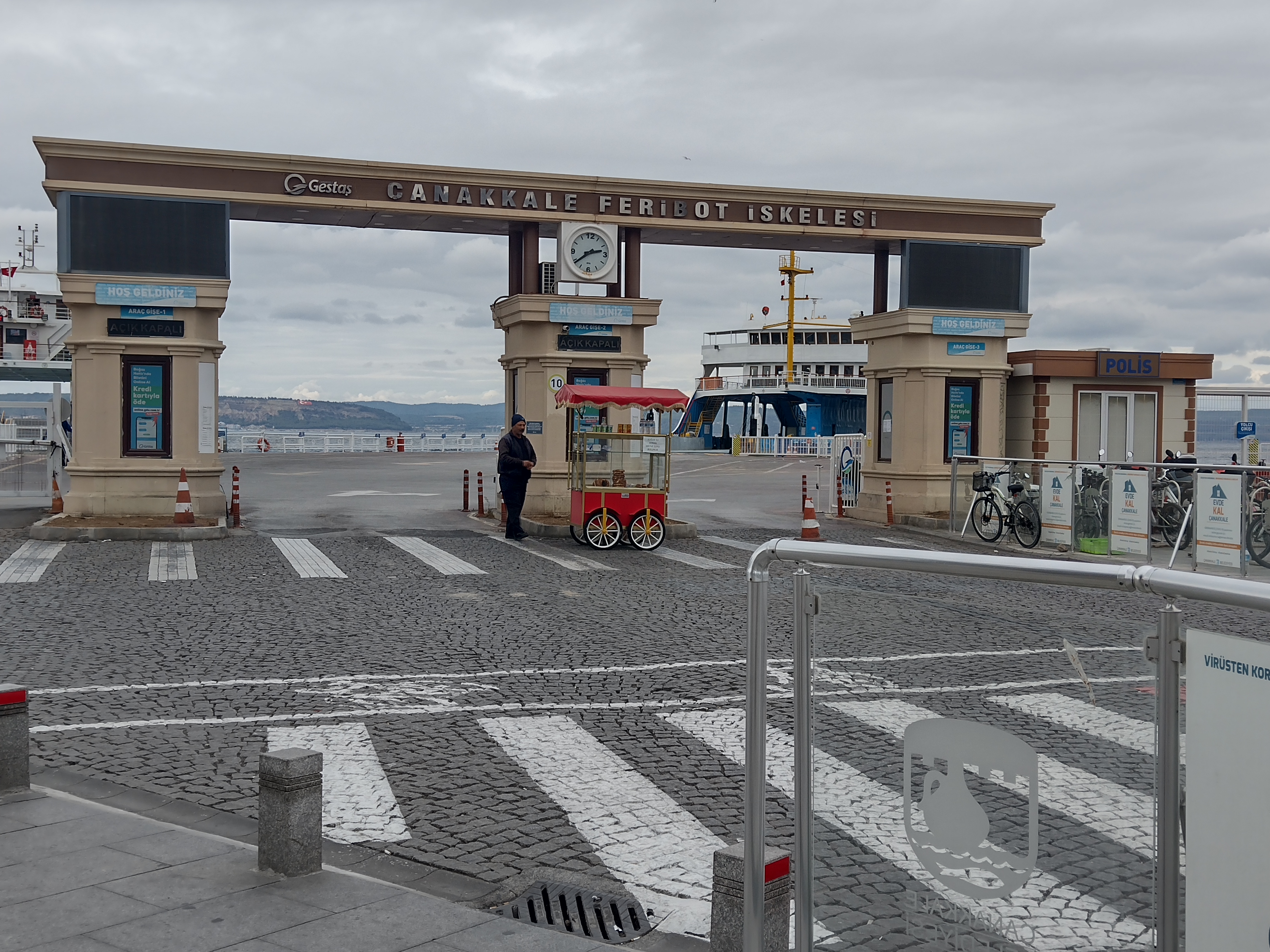 In Canakkale angekommen, mussten wir gleich einen Parkplatz finden. Der Intuition folgend, weil immer noch kein Internet, steuerten wir das Wohnmobil an der ersten Möglichkeit nach Verlassen der Fähre, nach rechts, um am Wasser zu bleiben. Zu unserem Glück fanden wir kurz vor der Inönü Köprüsü-Brücke einen Parkplatz.