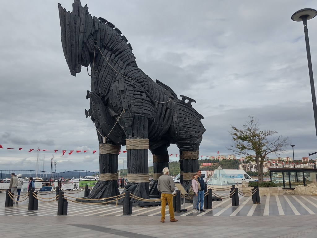 Bis ins Stadtzentrum zurück sind es nur ein paar hundert Meter, wo wir endlich alles fanden, was wir brauchten: eine SIM-Karte fürs Internet und einen HGS-Streifen bei der Post. Jetzt konnten wir wieder geplant fahren. Nachdem wir alles erledigt hatten, was einige Anstrengungen bedarf, spazierten wir am Kai und an der Marina entlang, tranken einen Kaffee und kamen zu einem Trojanischen Pferd. Wie sich herausstellte, ist es die Replik der Originalrequisite der Troja-Verfilmung aus dem Jahr 2004, aus alten Schiffsplanken zusammengezimmert. Ja, da passen schon einige Leute hinein. Gleich daneben steht ein Modell, wie Troja zuletzt ausgesehen haben mag.
