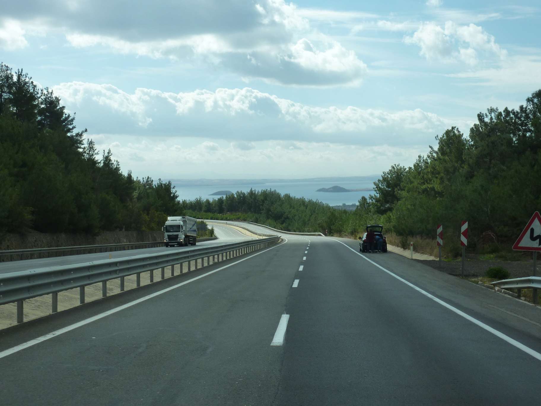 Hinter der bulgarisch-türkischen Grenze fährt man bis zur Ägäis durch hügeliges Bergland. Die Versuche an Geld oder eine SIM-Karte zu kommen, unser Handy streikte mit dem Grenzübertritt, blieben erfolgslos. Niemand spricht auch nur ein bisschen englisch, damit wir uns verständlich machen konnten. Ohne Handyempfang funktioniert auch kein Übersetzer. So blieb uns nichts weiter übrig, als bis Gelibolu durchzufahren. Das sind fast 300km. Bei Kavakli, an der E87, übernachteten wir in einem Picknickpark, um am nächsten Tag ausgeruht bis kurz vor Geliboglu zu fahren. Dort fanden wir endlich einen Geldautomaten und waren wenigstens dieses Problem los. Noch einmal mussten wir übernachten. Diesmal war es ein großes Denkmal mit Friedhof zu Ehren des medizinischen Personals, welches sich im Dardanellenkrieg 1915 um die Verwundeten der Schlacht kümmerten. Auf dem großen Parklatz steht man in Ruhe, mit WC und Waschbecken, die sogar nachts geöffnet bleiben.