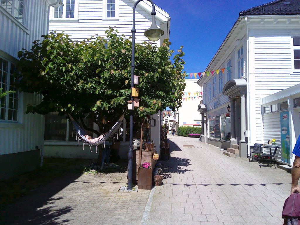 Über eine Fußgängerbrücke erreicht man das alte Zentrum von Flekkefjord, autofrei, wieder mit hübschen weißen Holzhäusern und liebevoller Gestaltung. In aller Ruhe kann man durch die Gassen schlendern und trifft doch irgendwann wieder auf Wasser.