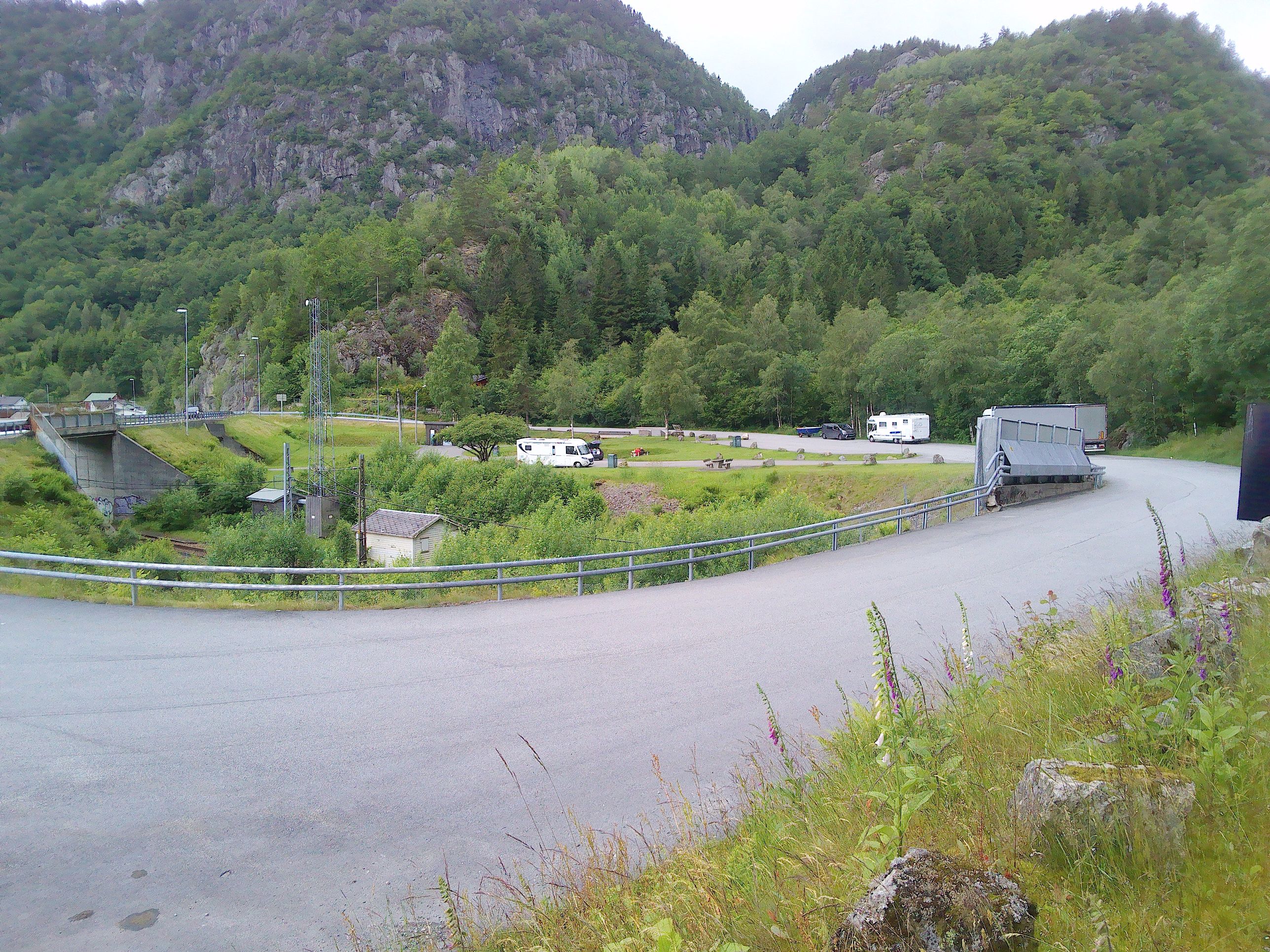 Ab hier geht es 3,8 km wieder nach unten. Die Panoramastraße endet bei Sirnes an einer historischen Hängebrücke. Die Straße wurde 1835-1840 als Verbindungsstraße für Postkutschen nach Stavanger gebaut, seither mehrmals erneuert. Das war ganz sicher nicht einfach, die Pferde mit den Wagen auf diesem Gefälle im Griff zu halten. Heutzutage ist die Abfahrt selbst für PKWs und Motorräder gesperrt. Wer also von der anderen Seite die Panoramastraße fährt, muss wieder umdrehen.