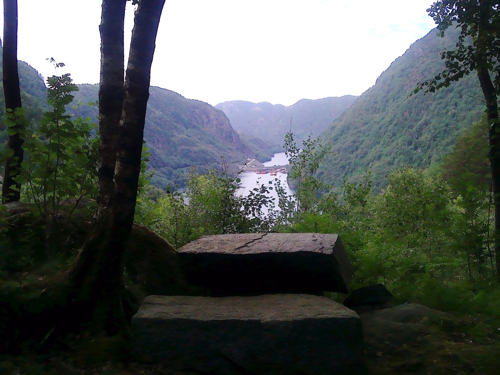 Den ersten Halt nach Erfjord legten wir am Lovra-Rastplatz ein. Dort steht etwas zurück gesetzt ein Steintisch mit einer Steinbank davor. Darüber hinweg öffnet sich der Blick über den Lovrafjord.