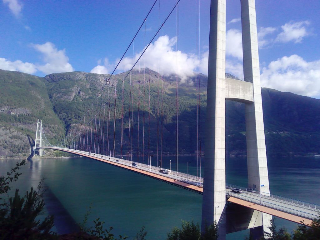 Inzwischen haben wir schon einige filigrane Hängebrücken über Fjorde gesehen, aber nur während der Fahrt. Hier hatten wir Gelegenheit, die 1380m lange Brücke aus der Nähe zu sehen und Fotos zu machen. Das ist schon ein Erlebnis.