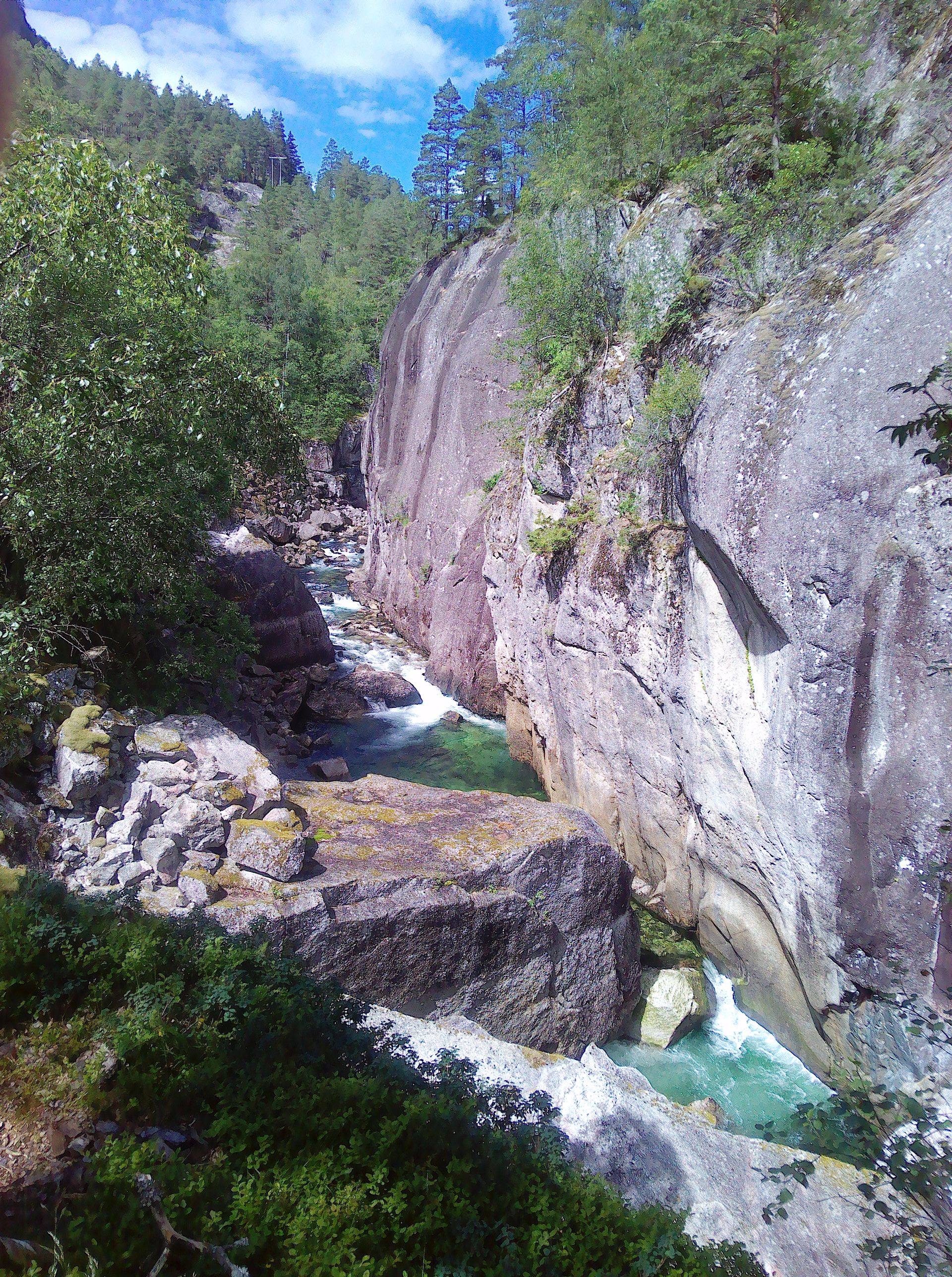 Im Suldal zu fahren ist nach den vielen nahen und steilen Felswänden eine Augenweide, denn dieses Tal ist grün, romantisch und weit geöffnet. An einem kleinen Rastplatz, direkt zwischen Straße und Fluss mussten wir wieder halten und ein paar Fotos machen. An der Flussbiegung kamen gerade ein paar Kühe an das Ufer, um zu trinken. Denen geht es richtig gut, saftiges Grün, Bäume für Schatten und den Fluss direkt vor der Haustüre.