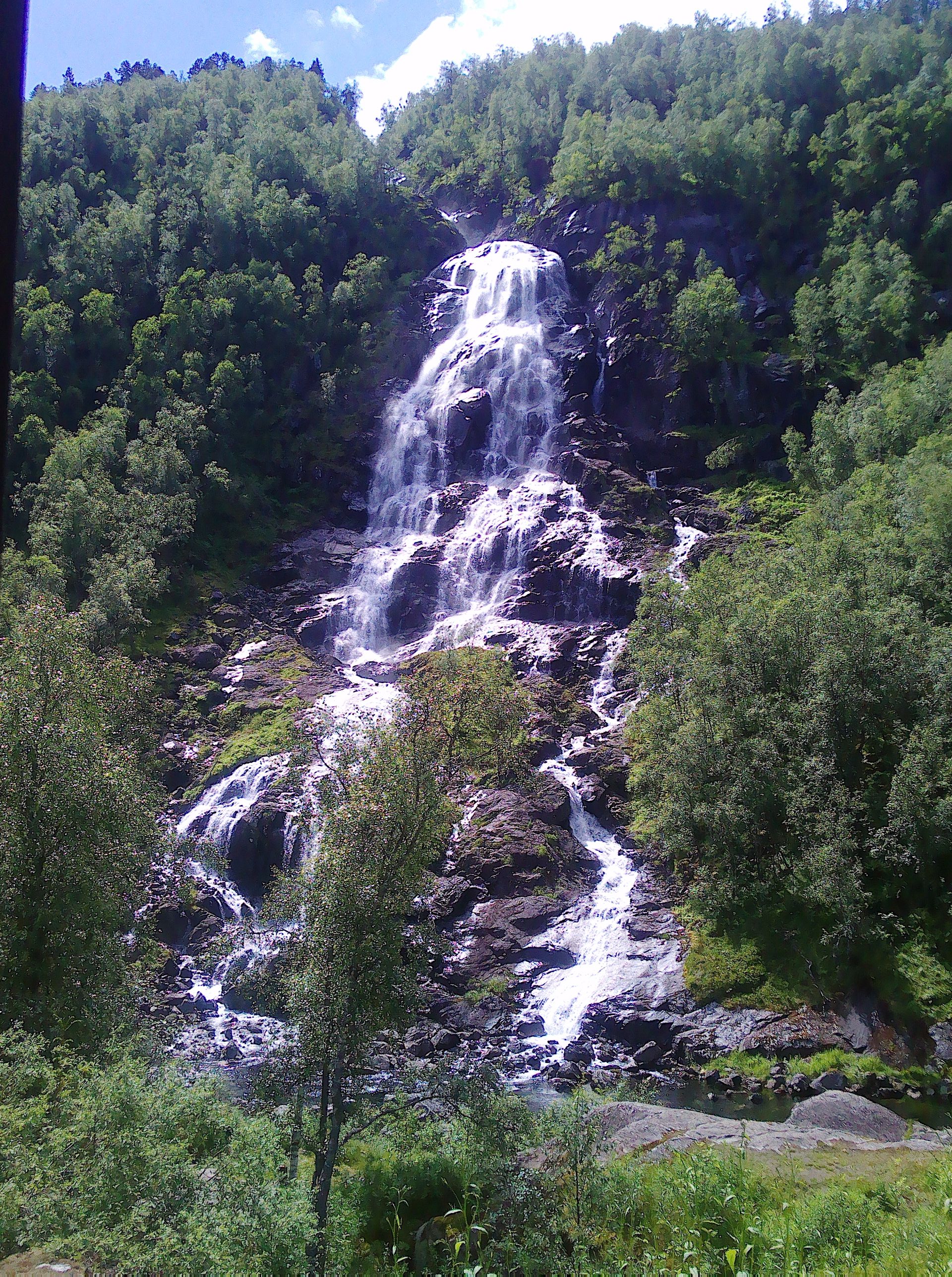 Gegenüber den Røldal-Terrassen ist der Røldal-Wasserfall zu sehen. Es ist einfach nur schön hier, so wie bis jetzt überall in Südnorwegen.