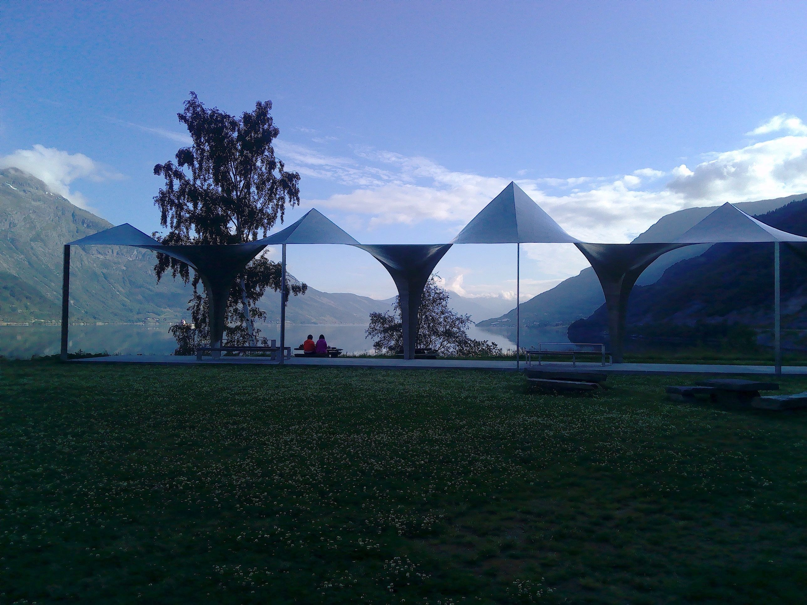 Den ersten Halt nach Erfjord legten wir am Lovra-Rastplatz ein. Dort steht etwas zurück gesetzt ein Steintisch mit einer Steinbank davor. Darüber hinweg öffnet sich der Blick über den Lovrafjord.
