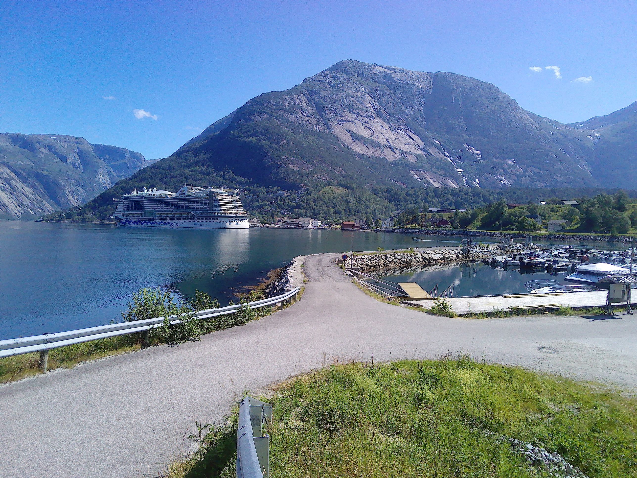 Jetzt endlich kamen wir nach Eidfjord. Kurz vor dem Örtchen stellten wir das Womo auf einem kleinen Parkplatz neben der Straße ab. Ein Kreuzfahrtschiff, in dem Fall die AIDAperla, hatte am Kai festgemacht.