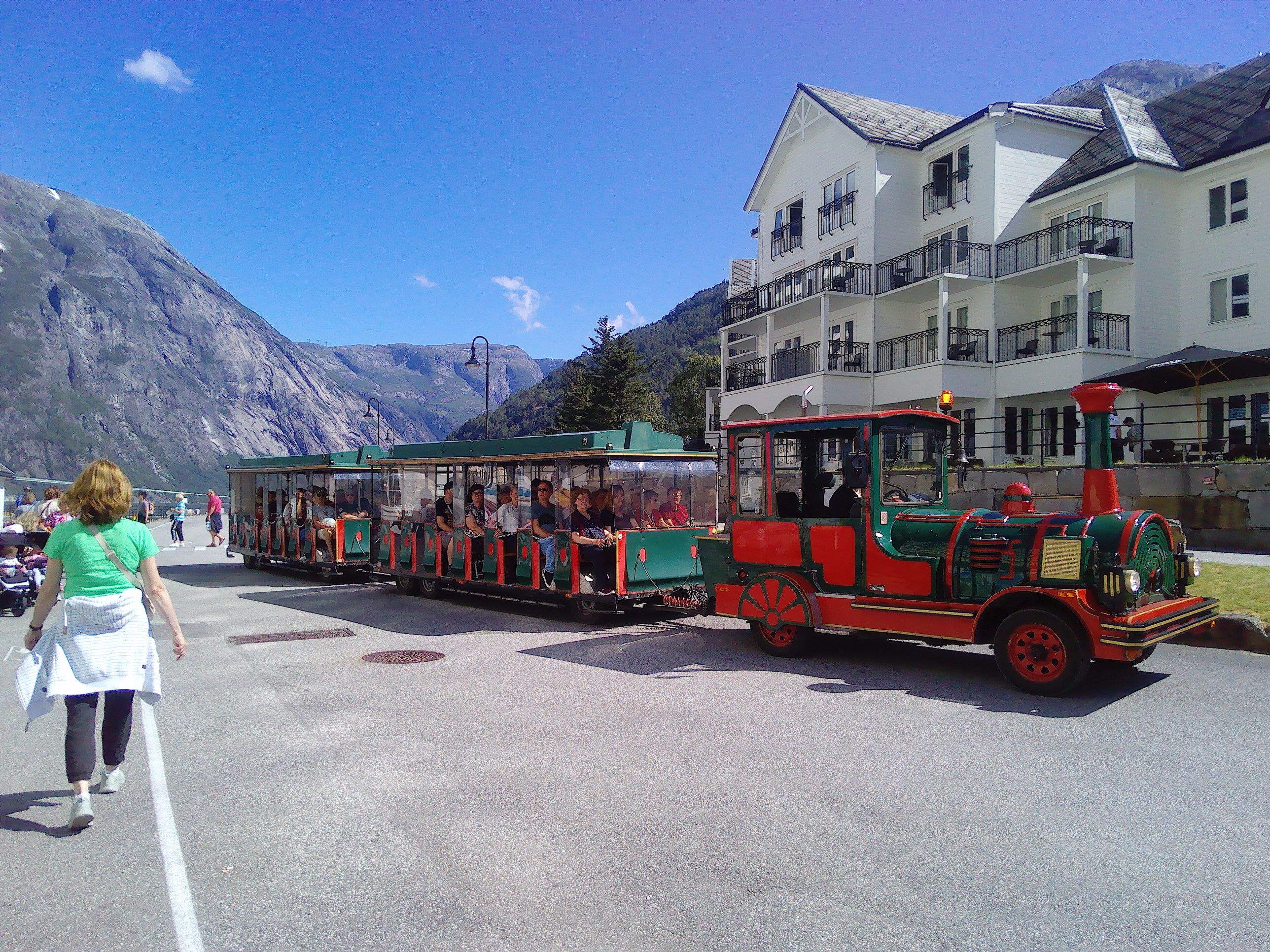 Zu Fuß gingen wir einen knappen Kilometer in den Ort. Trotz den Touristen vom Kreuzfahrtschiff lief alles ruhig und gemächlich ab. Man kann sich Eidfjord bei einem Spaziergang ansehen, ein Fahrrad oder Kanu ausleihen oder man fährt mit der kleinen Stadtbahn mit. Es ist wirklich nur ein kleiner, aber sehr schöner und schön gelegener Ort.