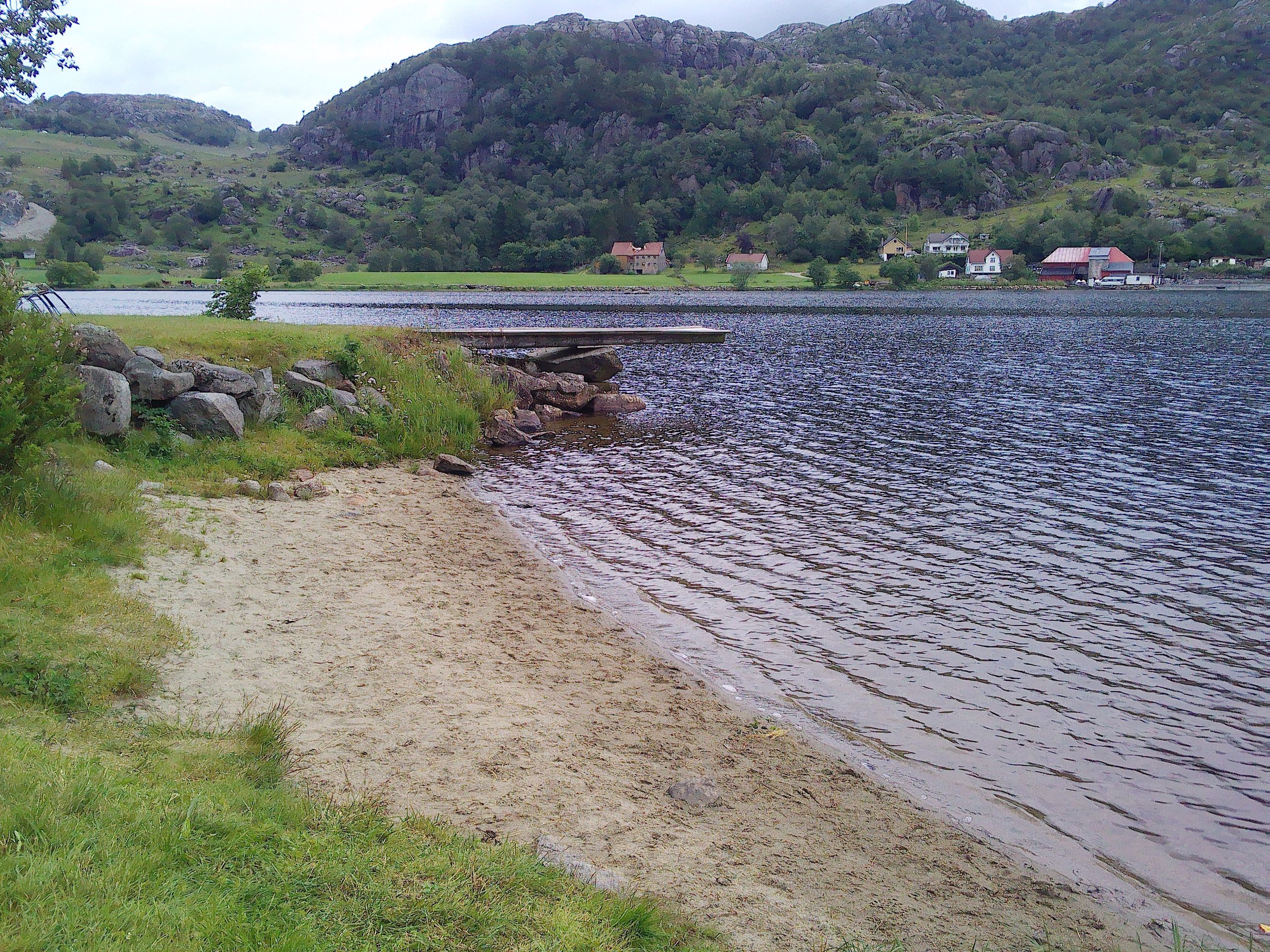 Unser nächstes Ziel sollte eigentlich Preikestolen sein, der berühmte, hoch über dem Lysefjord stehende Felsen mit dem glatten Plateau. Daher fuhren wir zuerst immer die E39 in Richtung Stavanger weiter. Da es gerade Sonntag war und wir nicht unbedingt an einem Wochenende zu dem stark besuchten Ausflugsziel wollten, legten wir vorher noch einmal eine Übernachtungspause ein, und zwar in Kyllingstad. Am Gemeindehaus der lockeren Ansammlung von Wohnhäusern und Firmen, am Ufer des langgezogenen See´s, befindet sich ein kleiner Platz mit Picknicktischen, einem Sandstrand und einer öffentlichen Toilette. Das Wetter war nicht so toll. Hier verbrachten wir den Tag mit einem Spaziergang und ruhten uns von der bisherigen Reise aus.