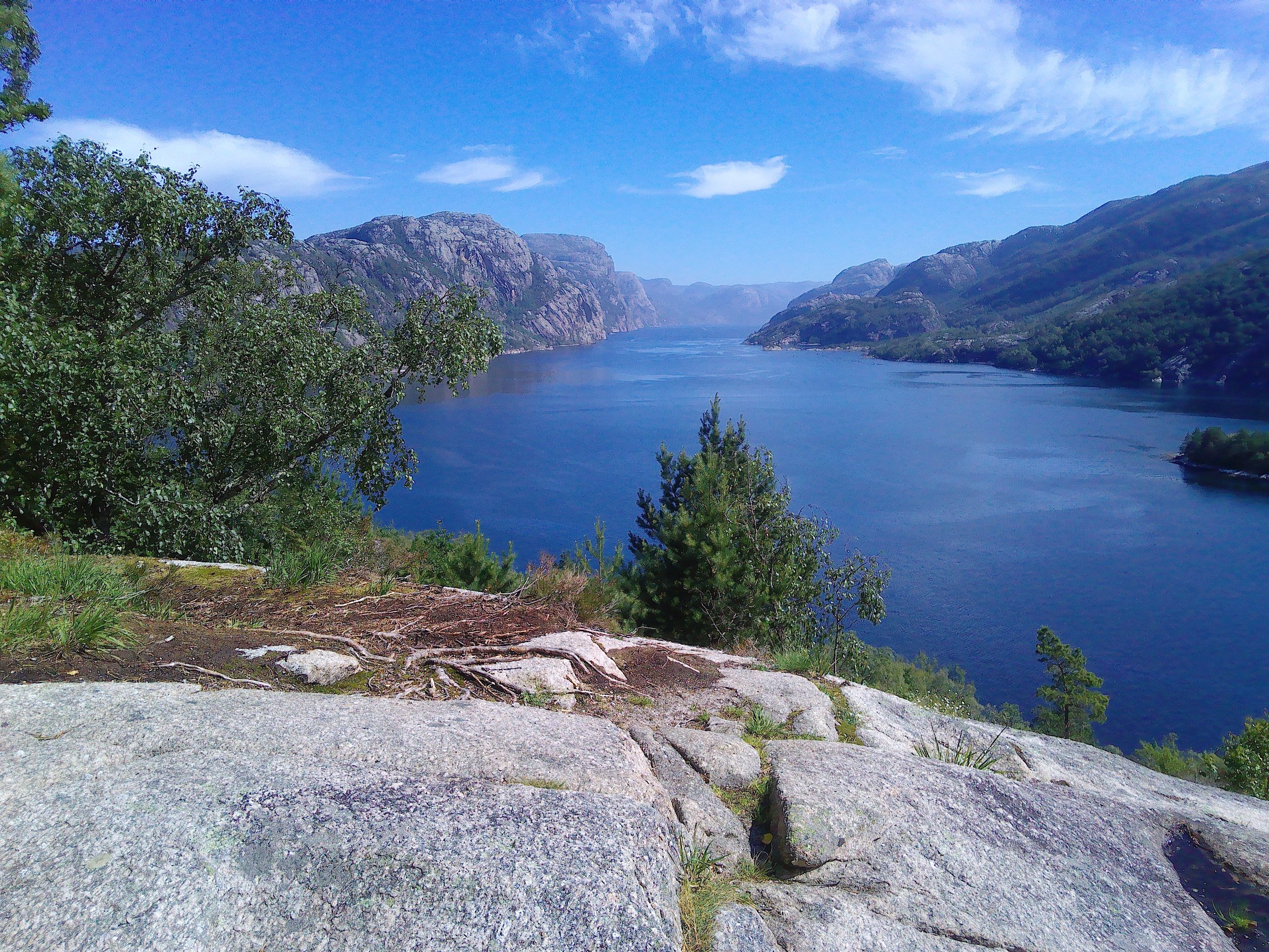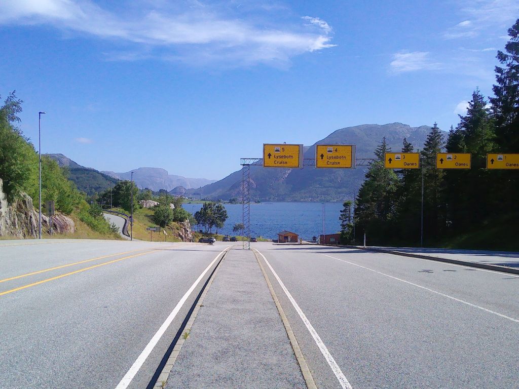 Nun fuhren wir auf der 523 über Jørpeland nach Solbakk. Kurz hinter Oanes lädt der Høllesli-Rastplatz dazu ein, das traumhafte Panorama den Lysefjord entlang zu genießen. Der Ausblick ist überwältigend.
