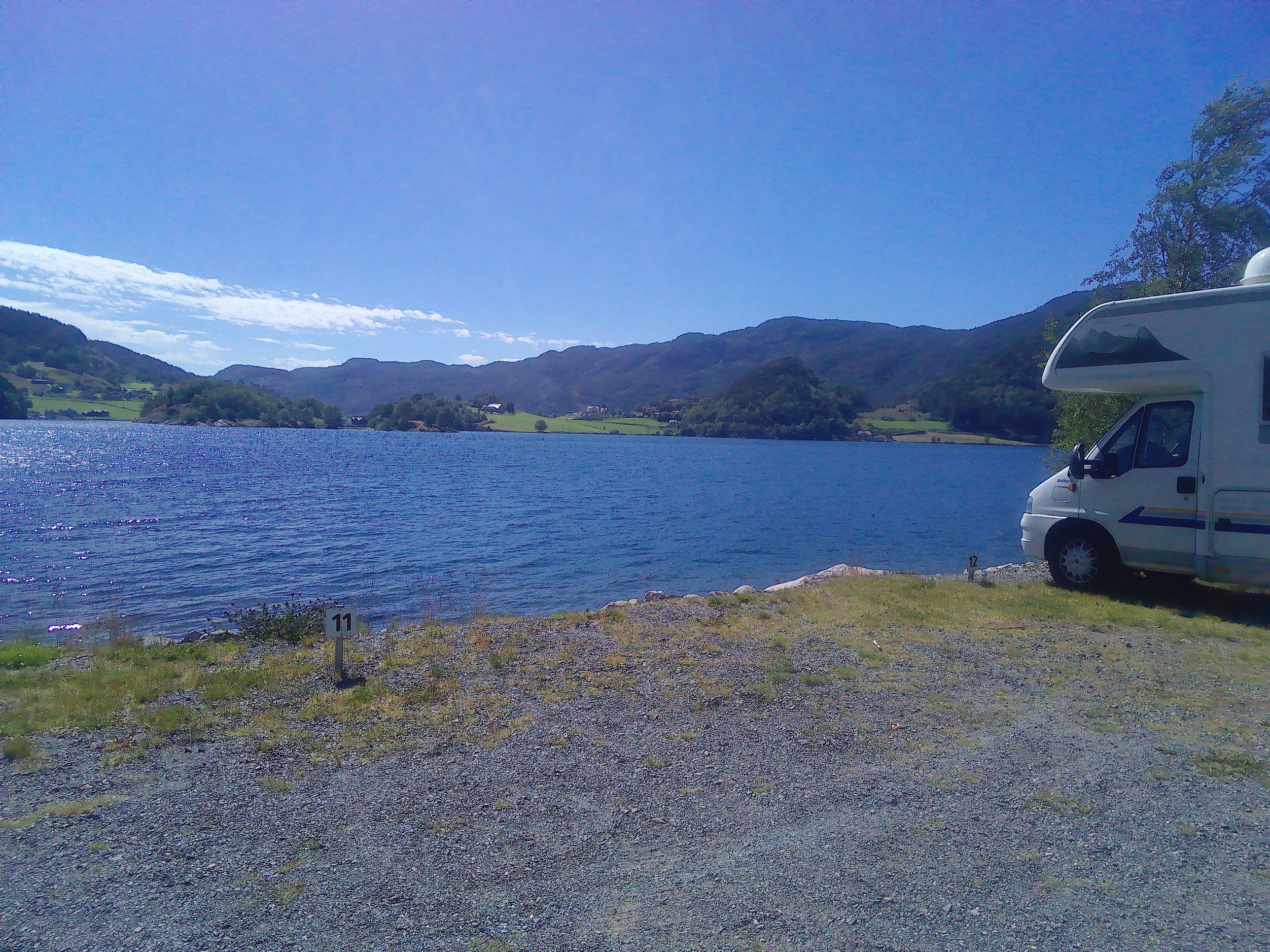 Diese wartete schon auf uns und für 19,-€ setzten wir in 15 Minuten nach Nesvik über. Immer entlang eines Fjordarmes mit beeindruckenden Aussichten suchten wir eine Möglichkeit zum Übernachten. Leider sind die Plätze alle winzig und liegen direkt neben der Straße. Also fuhren wir weiter nach Erfjord. Das gemütliche und hübsche Örtchen meinte, dass wir doch einmal anhalten und uns umsehen sollten. Dabei entdeckten wir den Stellplatz auf der anderen Seite der Flussmündung. Für nur 15,-€ steht man dort vom Feinsten. Es gibt zwar keinen Service, dafür ist das Ambiente umso besser, direkt am Fjordufer. Inzwischen wurde es so warm, dass man in Badeklamotten sitzen konnte, das erste Mal auf dieser Reise, die gestern eine Woche dauerte.