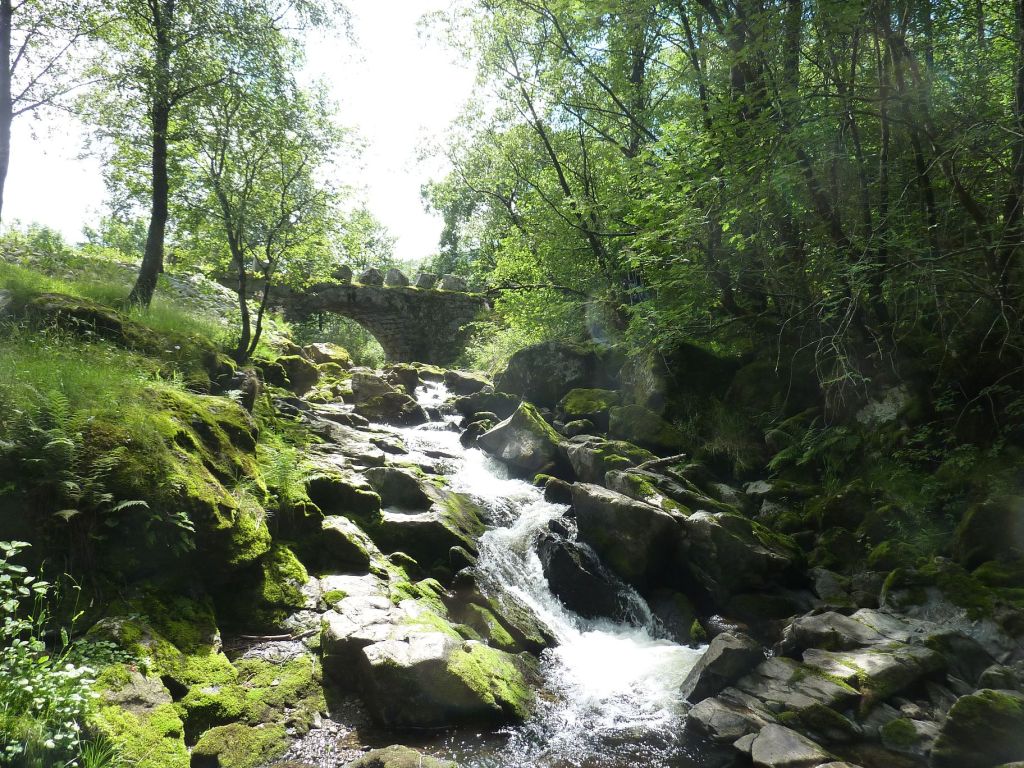 Kurz vor Hjelmelandsvagen liegt links der kleine Picknickplatz Hauske. Dort steht eine historische Steinbrücke aus dem Jahre 1905, die trocken gemauert wurde. Sie ist 14 Meter lang und 2,50m breit und war bis 1985 in Gebrauch. Sie überspannt den wilden Bach Hauskeas, daneben steht eine winzige Holzhütte. Hier legten wir unsere Kaffeepause ein und fuhren dann zur Fähre nach Hjelmelandsvagen.