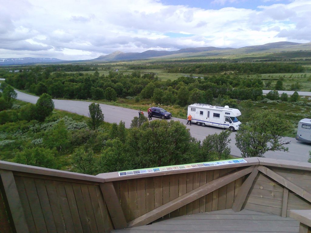 Auf dem Rastplatz Storrhusranden hielten wir zum ersten Mal. Dort steht auf dem Rullesteinen eine Aussichtsplattform, von der aus man einen tollen Rundumblick über das Dovrefjell hat, mit seinen Seen, weiten Flächen und den mit Schneeresten geschmückten Bergen. Allerdings lag die Temperatur bei unserem Aufenthalt gefühlt knapp über dem Gefrierpunkt. Vor allem der Wind blies kalt.