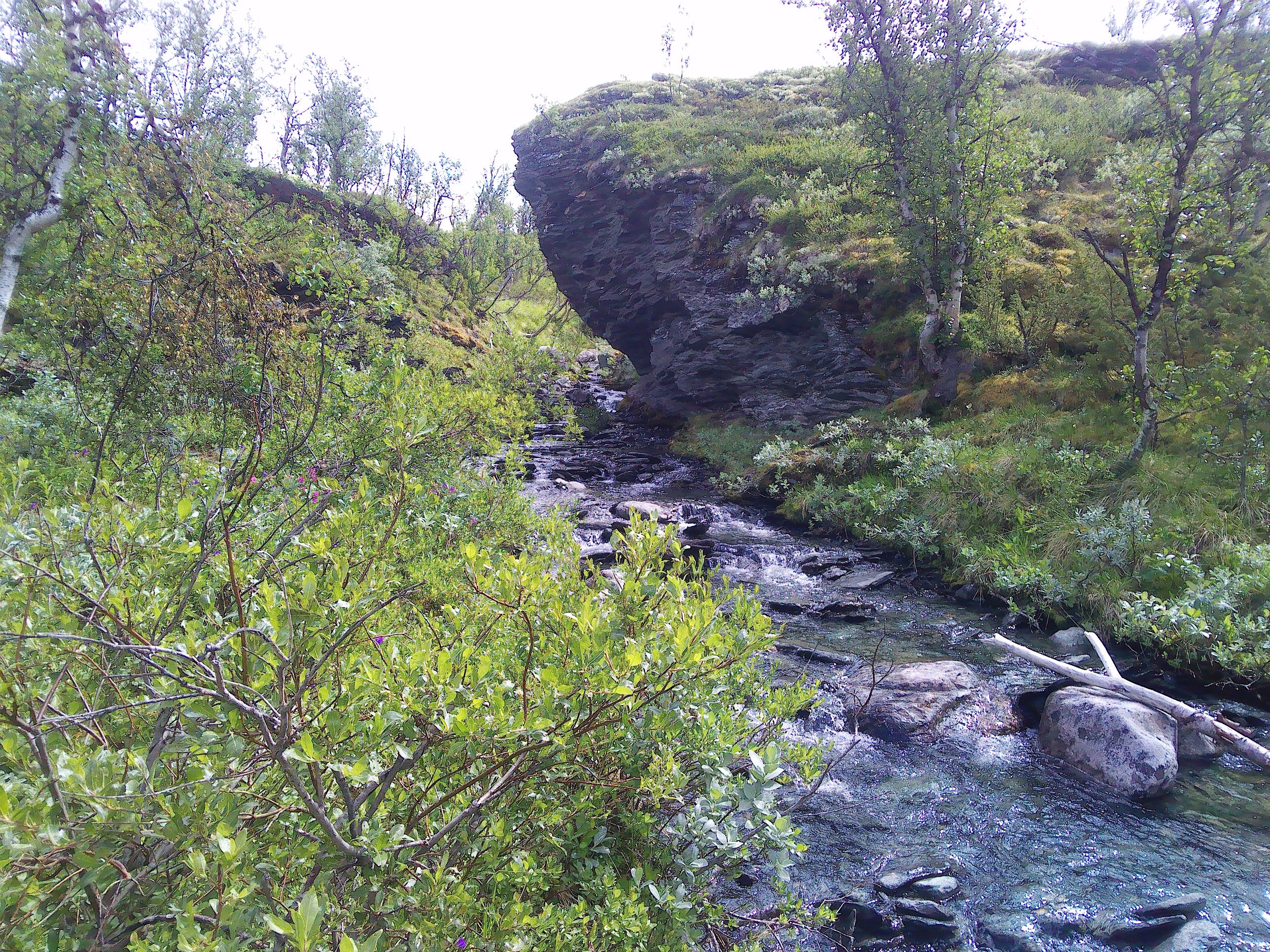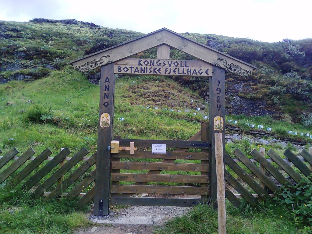 Den nächsten Stopp legten wir am Botanischen Garten Kongsvoll ein. Am Hang des an den Parkplatz grenzenden Berges wurde ein alpiner Garten angelegt, mit Holzstegen, Wegen und einem steil bergab fließenden Bach. Die allermeisten Pflanzen sind nur wenige Zentimeter hoch, die Schilder mit den Nahmen der Pflanzen stecken in der Erde. Man muss sich also alle Nase lang bücken. Trotzdem ist der Garten sehr interessant, denn man findet genau die Pflanzen, die überall auf den Hochebenen wachsen.