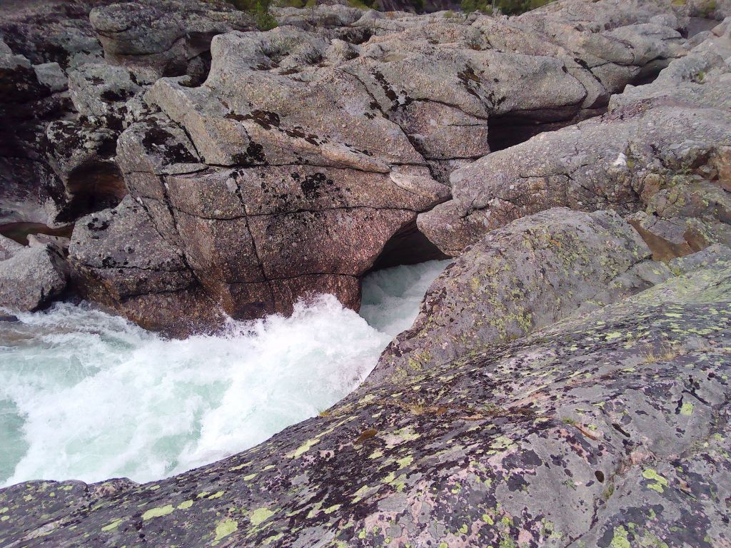 Den letzten Stopp machten wir am Mågålaupet. Das ist eine Engstelle im Fluss, die wirklich sehenswert ist. Das Wasser zwängt sich hier durch enge Felsspalten. Man kann sich das über die Felsen kletternd ansehen, oder man läuft den kleinen Trampelpfad entlang. Rafting ist an dieser Stelle jedenfalls ausgeschlossen. Das Schauspiel ist einfach nur gewaltig.