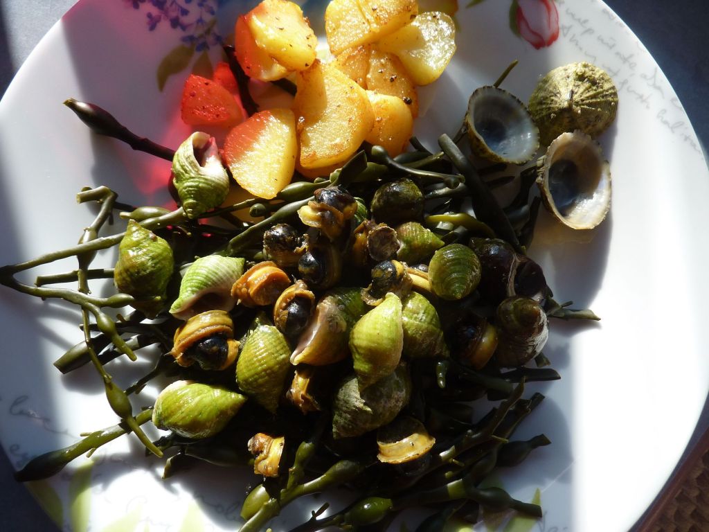 Zum Abend machten wir uns die Schnecken, die wir an einem Strand auf Hadseløya gesammelt hatten, und richteten sie auf einem Bett aus Blasentang, an Bratkartoffeln an. Hmm, das war lecker. Von dem Blasentang aßen wir nur ein paar Stängel. Auf Grund des hohen Jodgehaltes und mehrere spezieller Inhaltsstoffe sollte man nicht viel von dem Blasentang essen. Zudem besitzt er so viele Ballaststoffe, dass ein paar Stängel ausreichend sind. Dazu gab es Mädesüss-Tee.