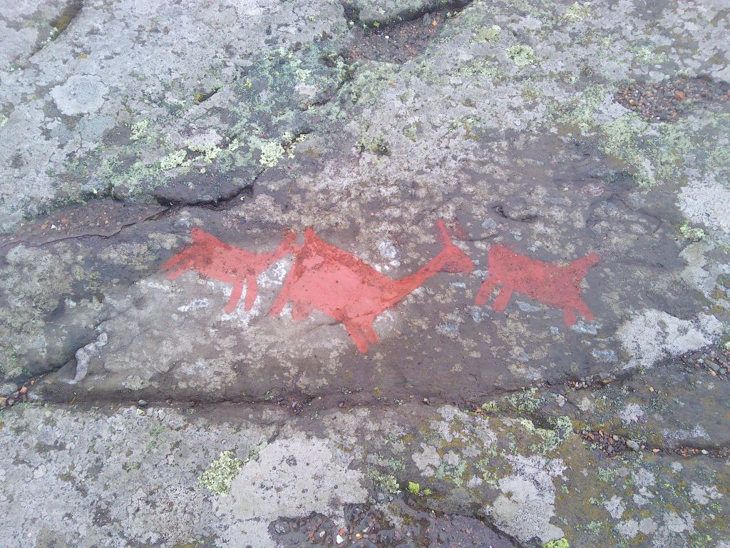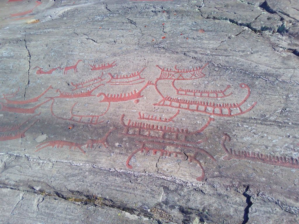 Am Stadtteil Himmelstalund, wo sich die Sportanlagen befinden, fließt ein Fluss vorbei. Auf der anderen Seite des Flusses fanden wir zufällig ein paar Felszeichnungen, die ca. 3000 Jahre alt sein sollen. Ganz deutlich ist zu erkennen, dass diese Zeichnungen von den Vorfahren der Wikinger in den Fels geritzt wurden. Es sind Tiere, ein Hundeschlitten, Schwerter und bemannte Langboote zu erkennen. Quer über den glatt geschliffenen Felsen verläuft zudem eine Bärenfährte. Es sind viele Zeichnungen erhalten. So weit im Süden hatten wir nicht mit so etwas gerechnet.