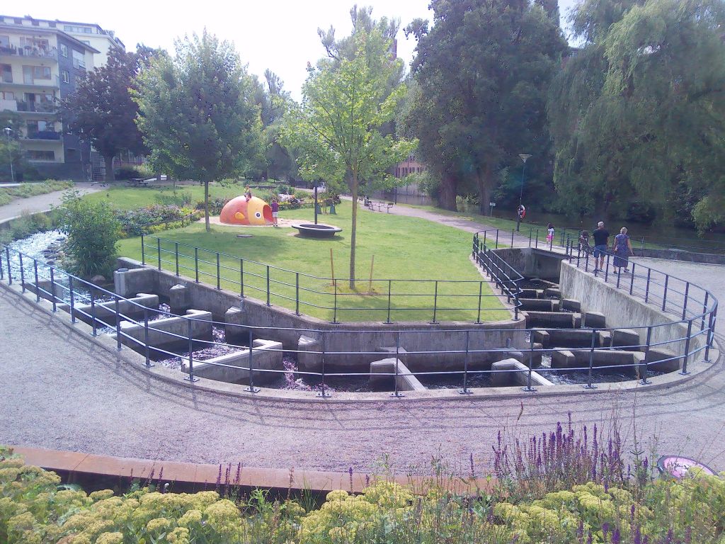 Wenn man am Fluss angekommen ist warten weitere Überraschungen. Der Fluss wird durch ein Wehr unterbrochen. Eine Infotafel klärt über die vielen Fischarten auf, die es im Fluss geben soll. Sogar Lachse sollen dabei sein. Damit diese den Fluss weiter nach oben passieren können, legte man am Flussufer in einem kleinen Park einen Bachlauf an, der in einer Fischtreppe endet.