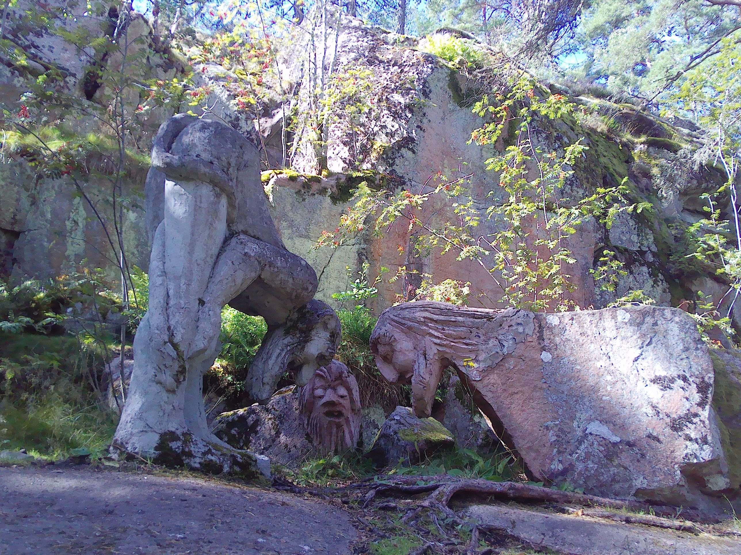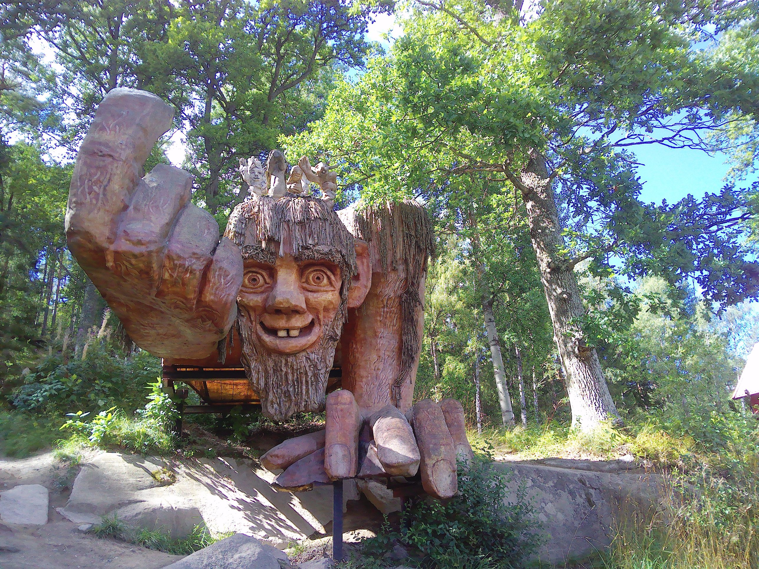 Wir hatten schon nicht mehr daran geglaubt, aber nun sind wir doch noch zu den Trollen gekommen. Auf dem Weg nach Kalmar (E22) kamen wir in Gamleby zum Trollpark Garpes Vänner. Vom großen Parkplatz führt ein siebenhundert Meter langer Wanderweg hoch in den Wald. Am Fuße des Wanderweges steht der Riese Garpe, der seine Gäste einlädt, seine ca. achtzig Trolle und Gefährten kennenzulernen, die auf dem Garpedansberget wohnen. Der Wald ist ursprünglich erhalten und mit vielen Verstecken trollgerecht.