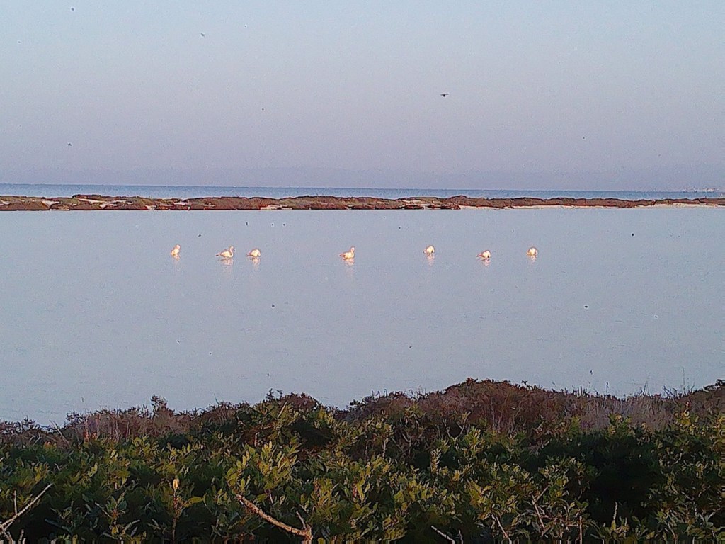 Während Klaus zurück zum Parkplatz am Strand Le Saline fuhr, spazierte ich den Rest des Weges zurück. Dabei sah ich mir die Ruinen der alten Salinenfabrik an und spazierte am Strand entlang. Der Sand ist grob und weiß, da er fast nur aus rundgeschliffenem Quarz besteht. Die Strandhütten sind allesamt geschlossen, die Zugänge fast alle marode oder teilweise zerstört. Die Flamingos hielten sich heute in einem anderen Salinenbecken auf, als gestern Abend.