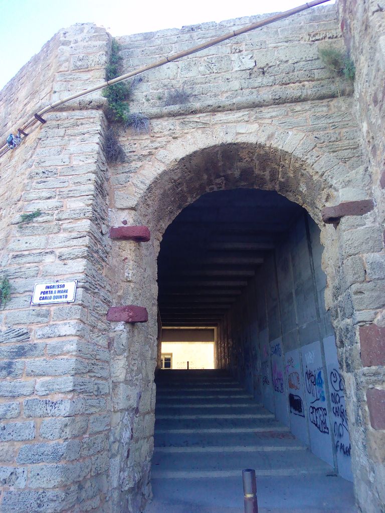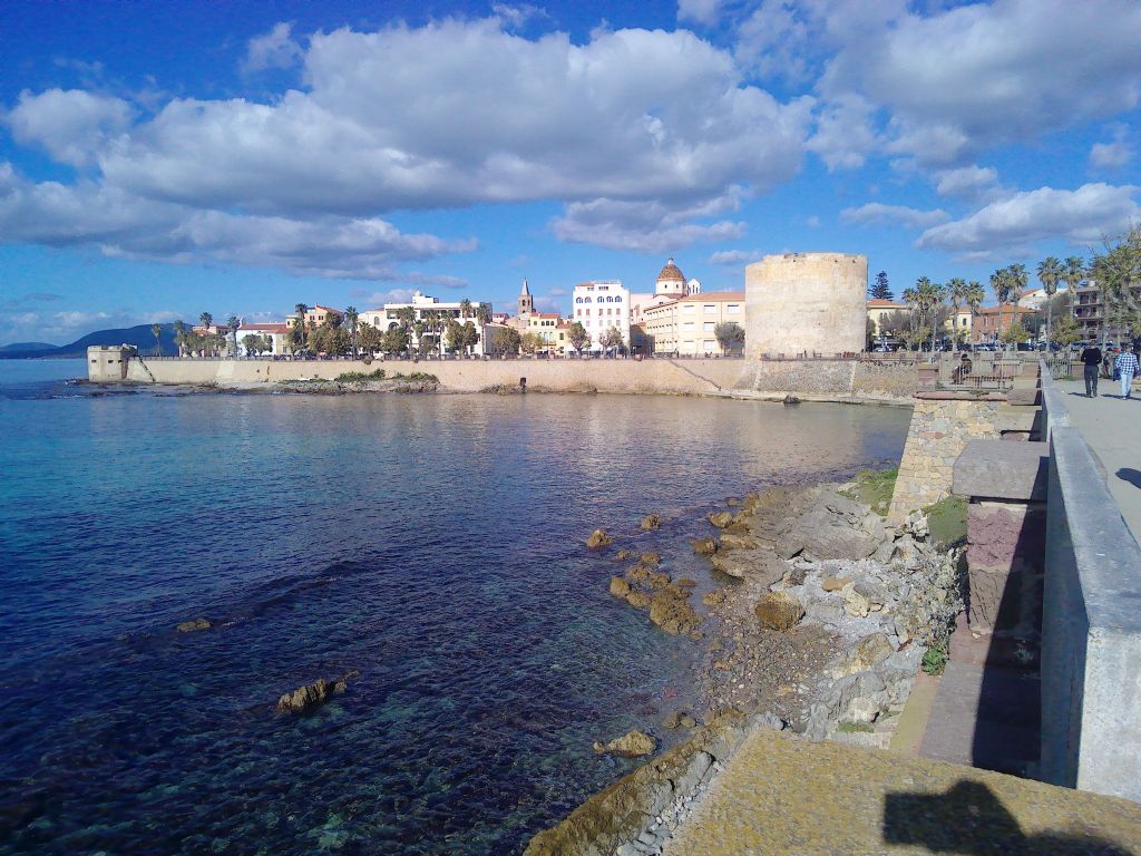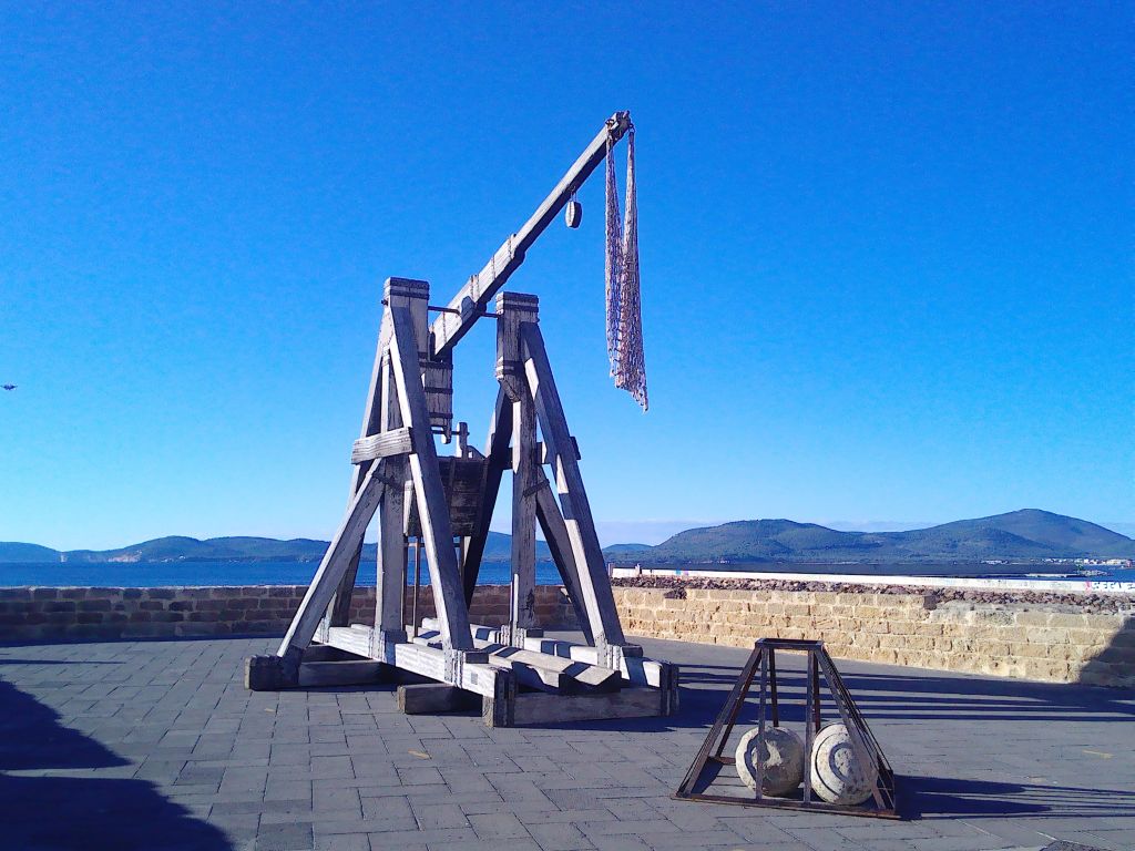 Die Aussicht von der westlichen Stadtmauer aus ist wunderschön. Gegenüber sind die hohen Klippen des Capo Caccia zu sehen. Auf der Mauer stehen mehrere Katapulte aus grauer Vorzeit, und einige verrostete Kanonen aus etwas jüngerer Zeit.