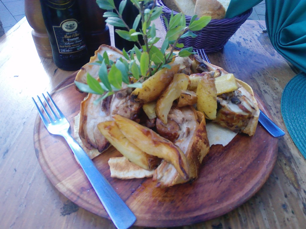 Beim Spazieren gehen trafen wir auf ein Restaurant, in dem Spanferkel angeboten wird. Das ist etwas, was ganz und gar sardisch ist und man auf jeden Fall probiert haben sollte. Der Kellner machte auch gleich das Angebot, dass wir uns eine Portion teilen könnten, dazu Kartoffelspalten und ein Gläschen Prosecco. Wir nahmen in der ersten Reihe, mit Blick auf das Meer, Platz. Das Spanferkel war vom allerfeinsten, wunderbar zart mit knuspriger Schwarte. Vier Stunden hat es im Ofen gegart. Die Portion (25,-€) war so reichlich, dass wir beide davon satt geworden sind. Der kühle Prosecco passte sehr gut dazu.