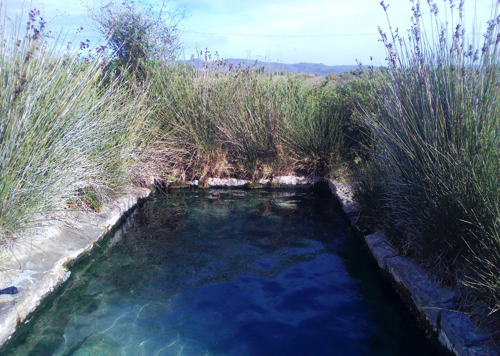 Südwestlich von Benetutti liegt der Ort Terme Aurora. Na ja, nicht wirklich ein Ort, eher ein Thermen-Hotel San Saturnino, jetzt geschlossen, eine Pferderennbahn und mehrere alte Termenbecken. Nur eines davon ist offen und kann jederzeit besucht werden, die Terme Libere. Zwei Personen können darin gut baden und ein klein wenig schwimmen. Es soll der Rest eines römischen Bades sein und liegt offen mitten in der Landschaft. Über einen Fußweg von der Straße aus erreicht man das Becken. Das Wasser hat Badewannentemperatur, ist glasklar und ein bisschen schwefelig. Es quillt aus dem sandigen Boden, zu erkennen an den aufsteigenden Blasen. Zu unserer Badezeit kam sogar ein wenig die Sonne heraus. Es war herrlich und wir waren allein.