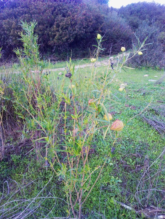 Am Boden wachsen Meerzwiebeln, eine Lilienart, und Schwanen-Seidenpflanzen. Bis vor einem Jahr wussten wir noch nichts von Seidenpflanzen. Inzwischen kennen wir drei, die wir in der Türkei, auf Öland (Schweden) und jetzt hier auf Sardinien gefunden haben. Es sind faszinierende Pflanzen und sofort zu erkennen. Die großen Früchte enthalten viele Samen, deren seidige Anhängsel sich, wenn die Früchte aufplatzen, groß aufblähen und damit zur Verbreitung der Samen beitragen. Auch die Blüten sollen sehr schön sein, aber da kamen wir immer zu spät.