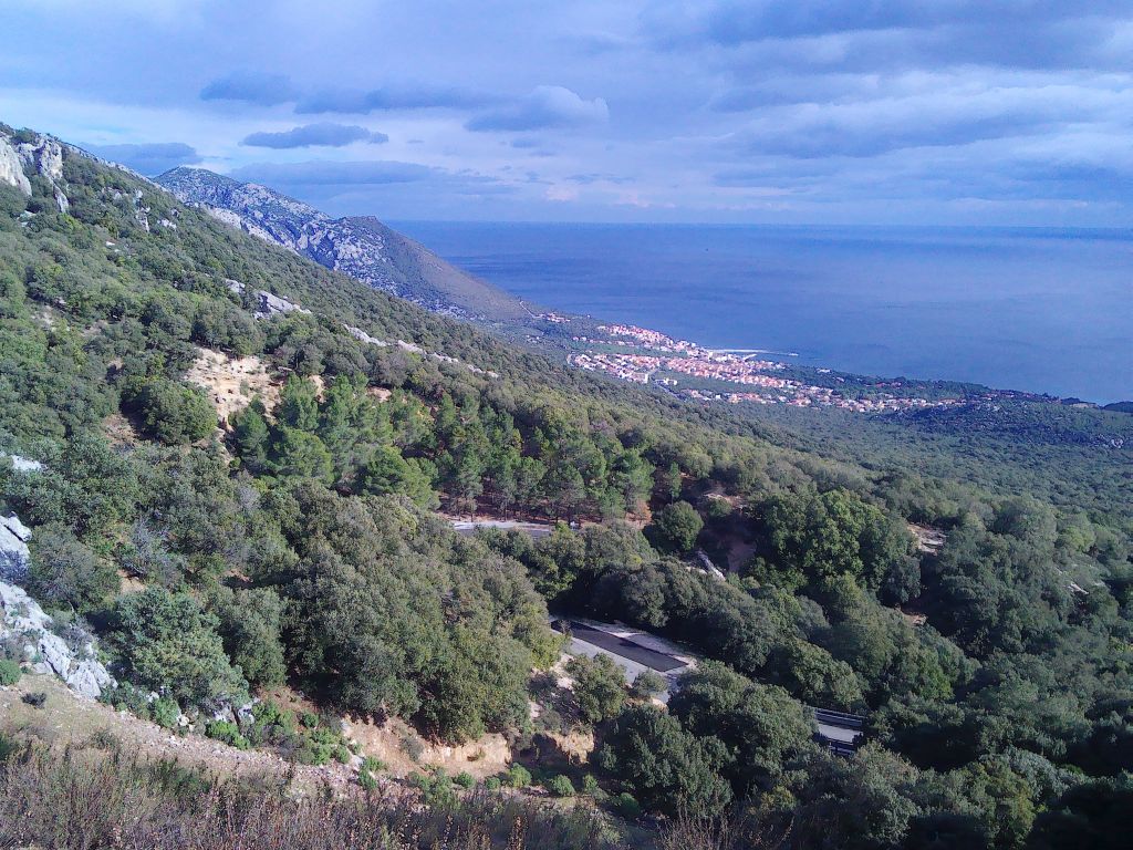 Nur wenige Kilometer weiter zweigt die Serpentinenstraße nach Cala Gonone ab. Direkt hinter der Abzweigung fährt man durch einen gut vierhundert Meter langen Tunnel. Gleich dahinter liegt ein Parkplatz (444m hoch) mit einer wunderbaren Aussicht auf den Küstenort Cala Gonone. Der Ort ist der einzige Zugang zur felsigen Küste des Golfo di Orosei. Die Ausläufer des Supramonte-Gebirges reichen hier dreißig Kilometer lang bis ans Meer. Es gibt in diesem Bereich keine Straßen mehr. Alles ist nur noch zu Fuß oder per Boot zu erreichen. Man findet hier viele Grotten und Höhlen, wie auch im gesamten Gebirge. An der Küste gibt es sogar eine Blaue Grotte. Leider fahren im Winter keine Boote dorthin. Auf jeden Fall ist es ein interessantes Wandergebiet.