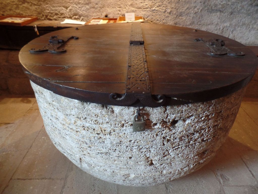 Dann spazierten wir zurück, um die kleine Kirche Santa Maria de Porqueres zu besichtigen, die vom Seeufer aus zu sehen ist. Sie ist schlicht, von außen wie auch innen, aber sie ist anheimelnd. Das Taufbecken wurde aus einem Kalksteinblock hergestellt und mit einem Holzdeckel, der schöne Stahlbeschläge aufweist, verschlossen.