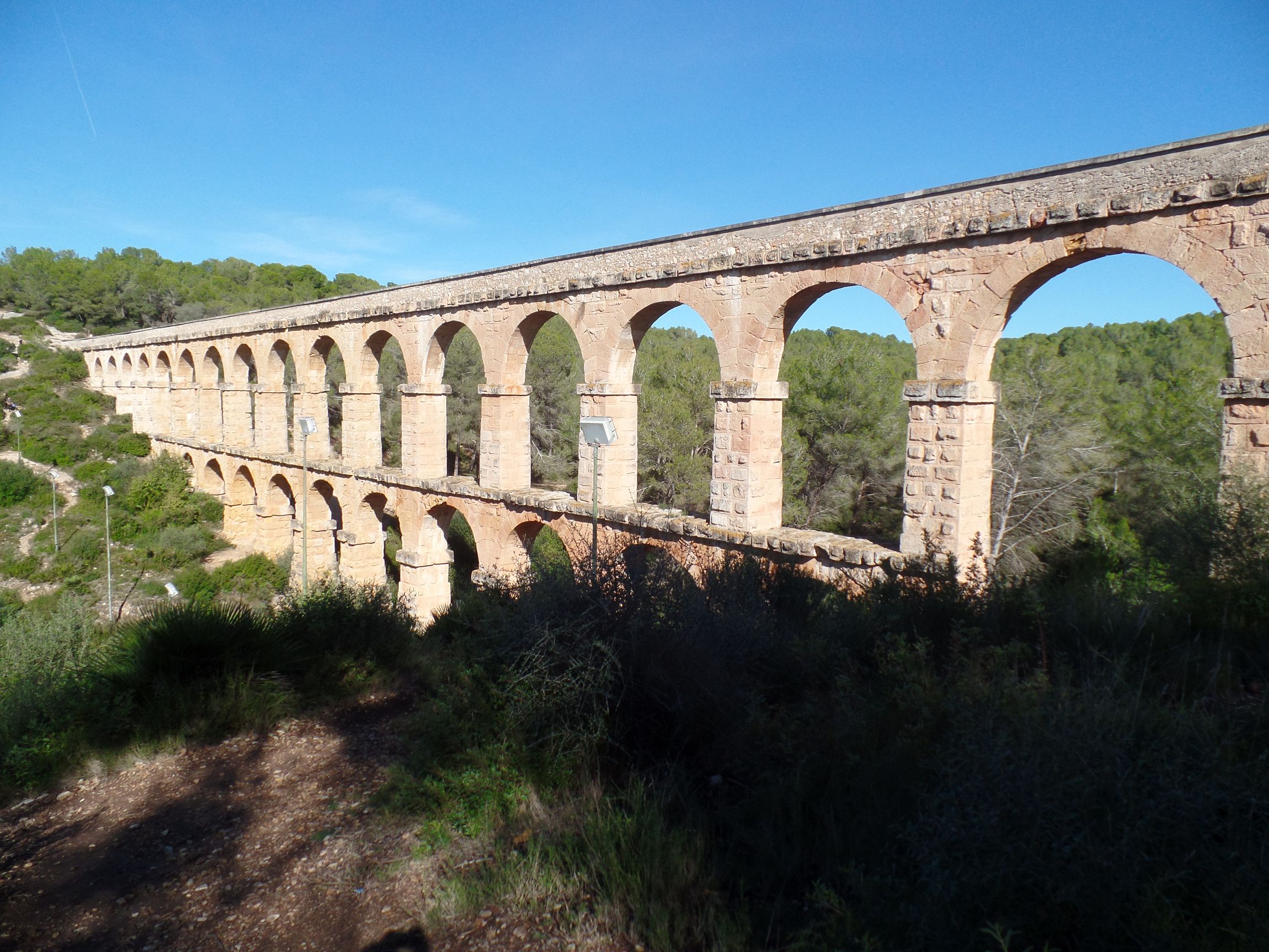 Also fuhren wir weiter gen Süden, nach Salou. Dabei kamen wir im Norden Tarragonas zur Teufels-Brücke, einem sehenswerten römischen Aquädukt aus dem 1. Jahrhundert. Der Parkplatz liegt direkt an der Straße, von dem aus man einen ersten Blick auf das Aquädukt werfen kann. Es hat eine Länge von 217 Metern, eine maximale Höhe von 56,8 Metern und wurde aus Sandstein erbaut. Es besteht auch die Möglichkeit das Aquädukt entlang des Wasserkanals zu überqueren, aber im Moment standen dort zu viele Pfützen.