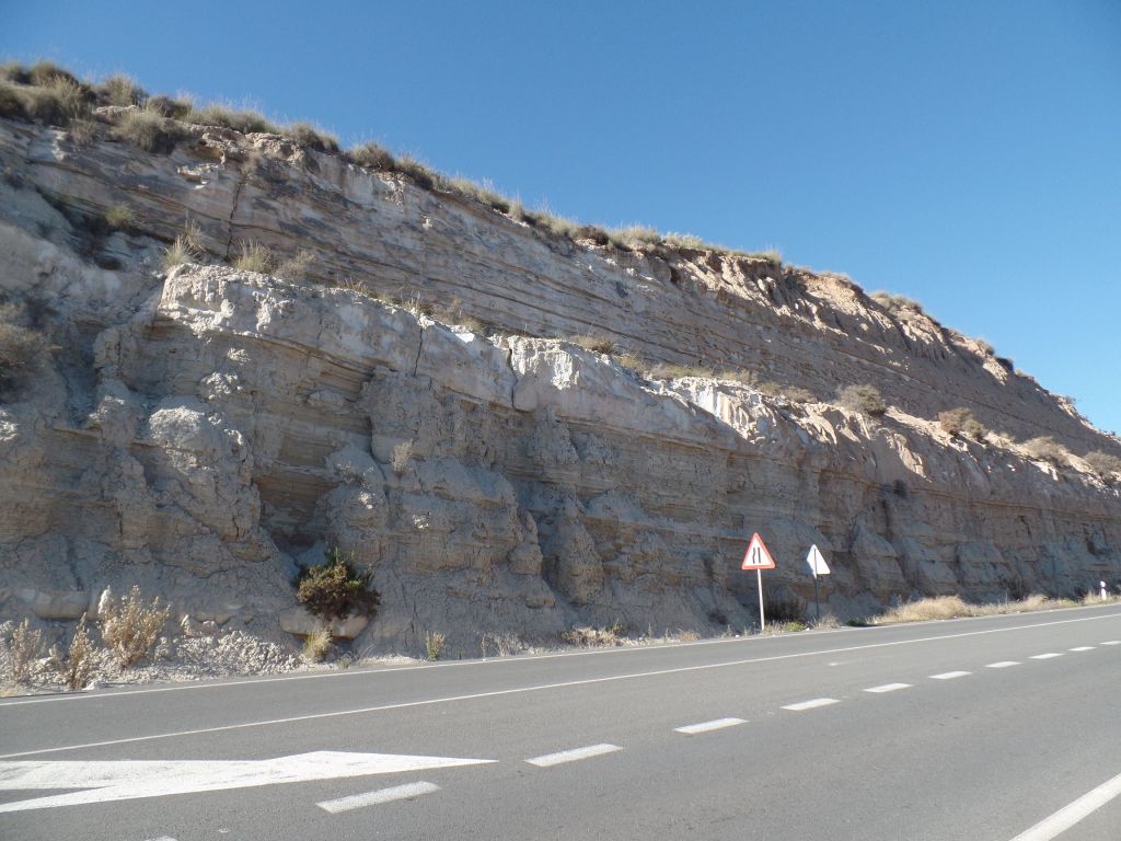 Geht man die Straße nur einen Kilometer weiter, kommt man wieder zu einem Felsaufschluss. Es zeigt sich immer das gleiche Bild wie in Bolnuevo, was den Schichtenaufbau angeht. Da wir uns nun etwas weiter im Landesinneren befinden, war das „Ur“Mittelmeer wohl einiges größer als heute.