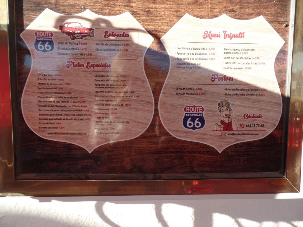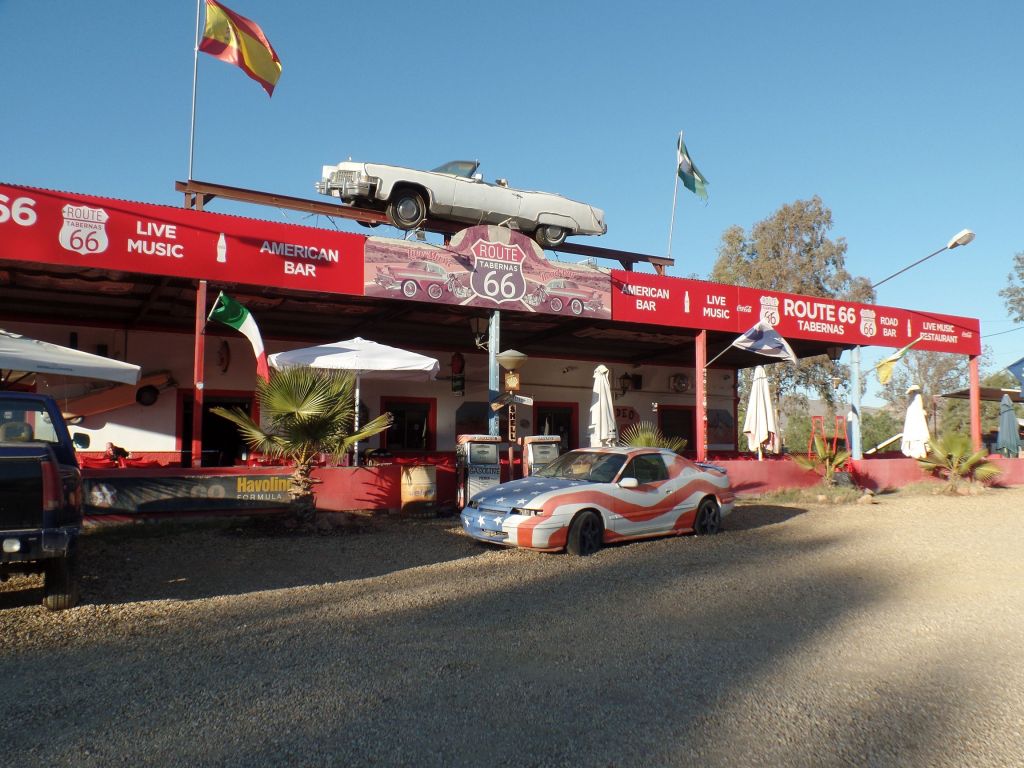 Nun fuhren wir weiter in Richtung Tabernas. Wenige Kilometer vor dem Ort Tabernas liegt die amerikanische Bar „Route 66“ am rechten Straßenrand. Dies war unser Ziel für den Tag, wo wir auch übernachteten. Die Bar bietet einen Stellplatz mit Annehmlichkeiten für 10,-€ die Nacht an, und den Parkplatz an der Straße, ohne alles für 5,-€.
