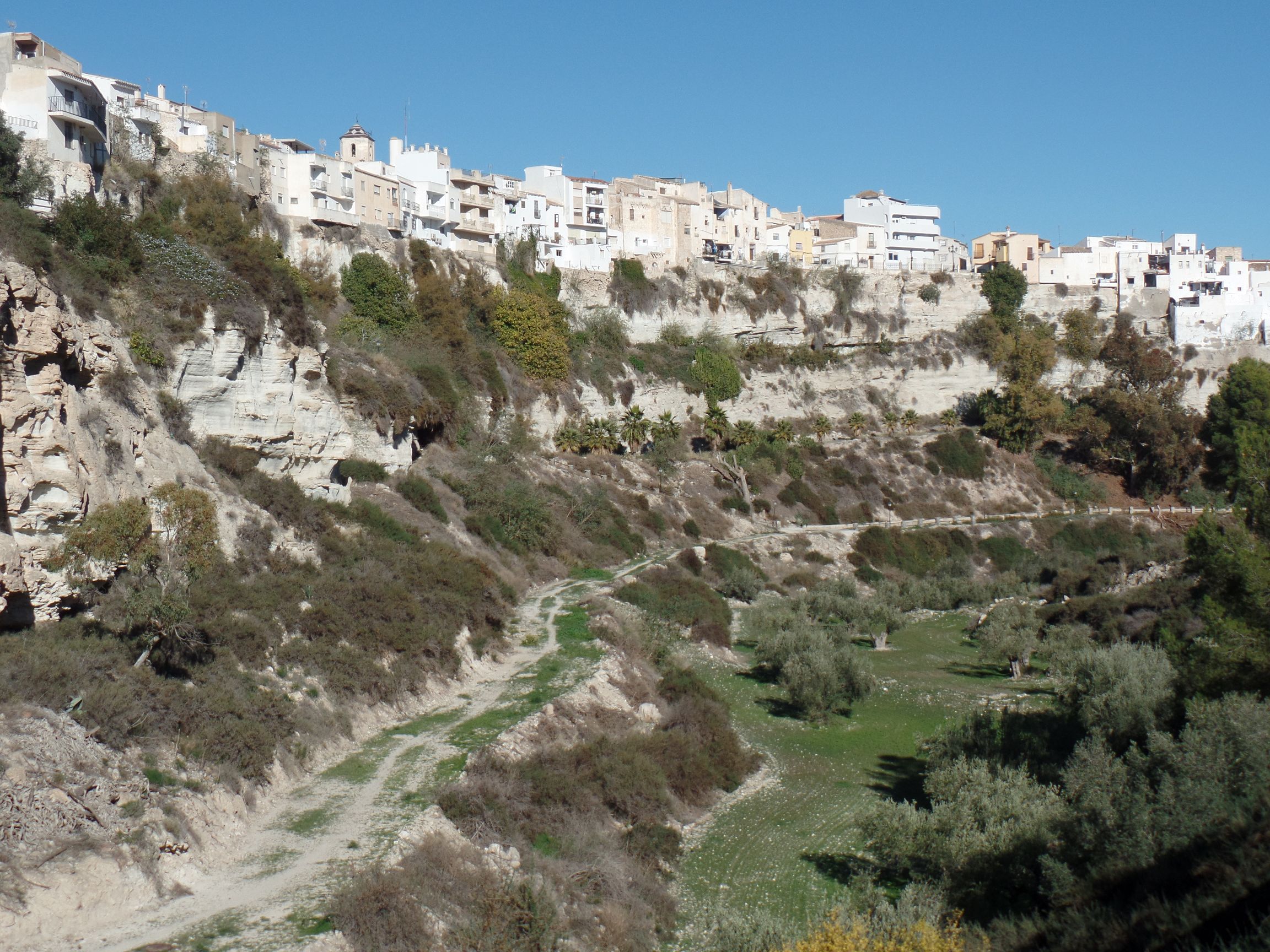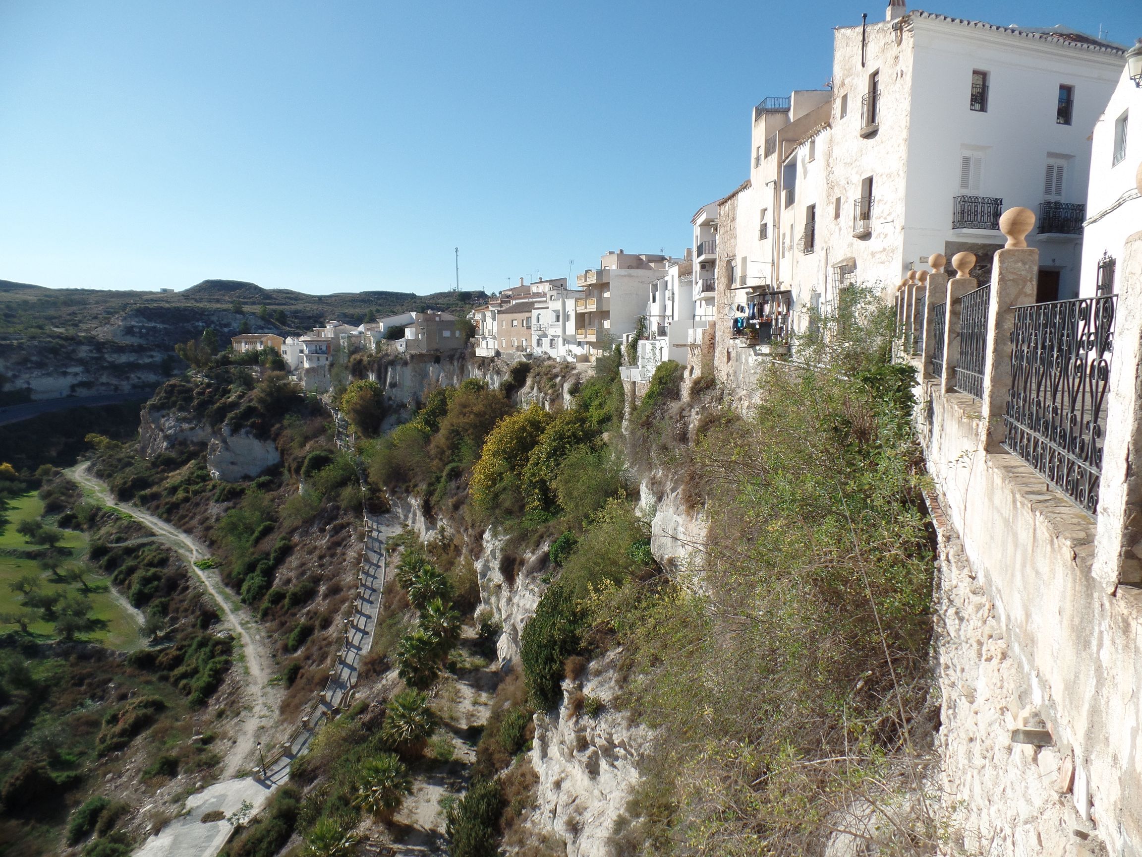 Nicht weit vor Tabernas liegt die Stadt Sorbas. Die N340/N340a, der wir lange Strecken folgen, führt direkt an der Altstadt Sorbas vorbei. Der Anblick macht neugierig, denn sie liegt auf einer Felsnase. Die äußeren Häuser sind direkt am senkrechten Abgrund gebaut.