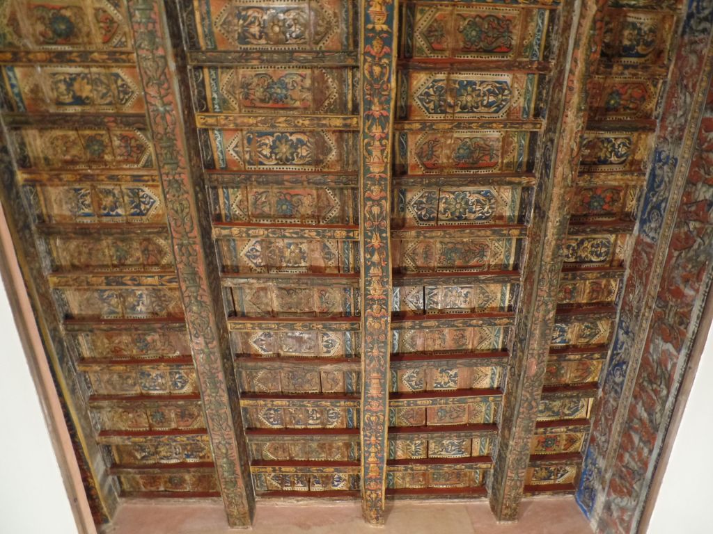 Eine mittelalterliche bemalte Holzkassettendecke schmückt einen der Räume.