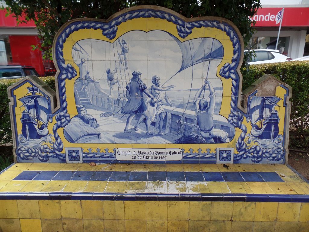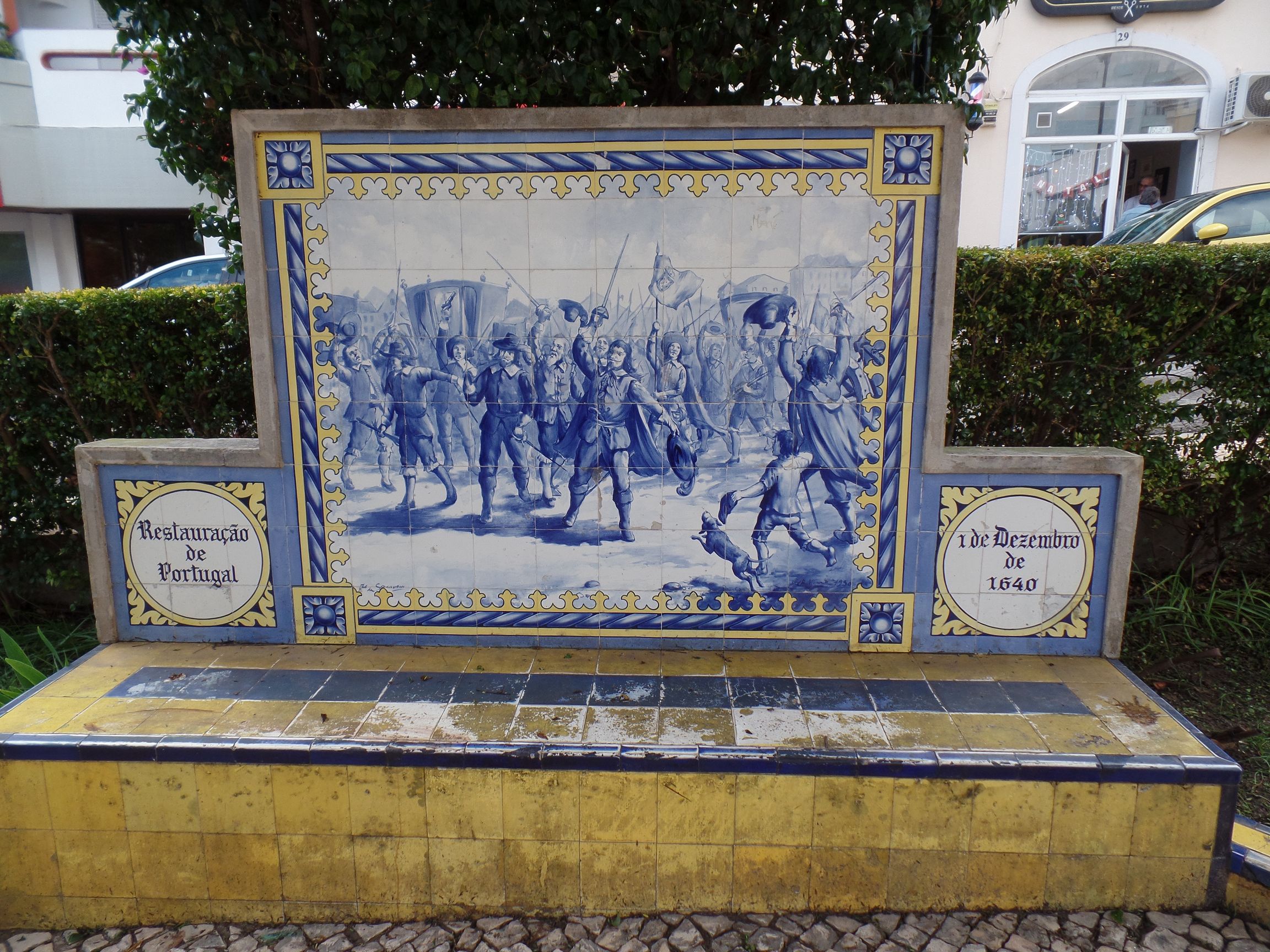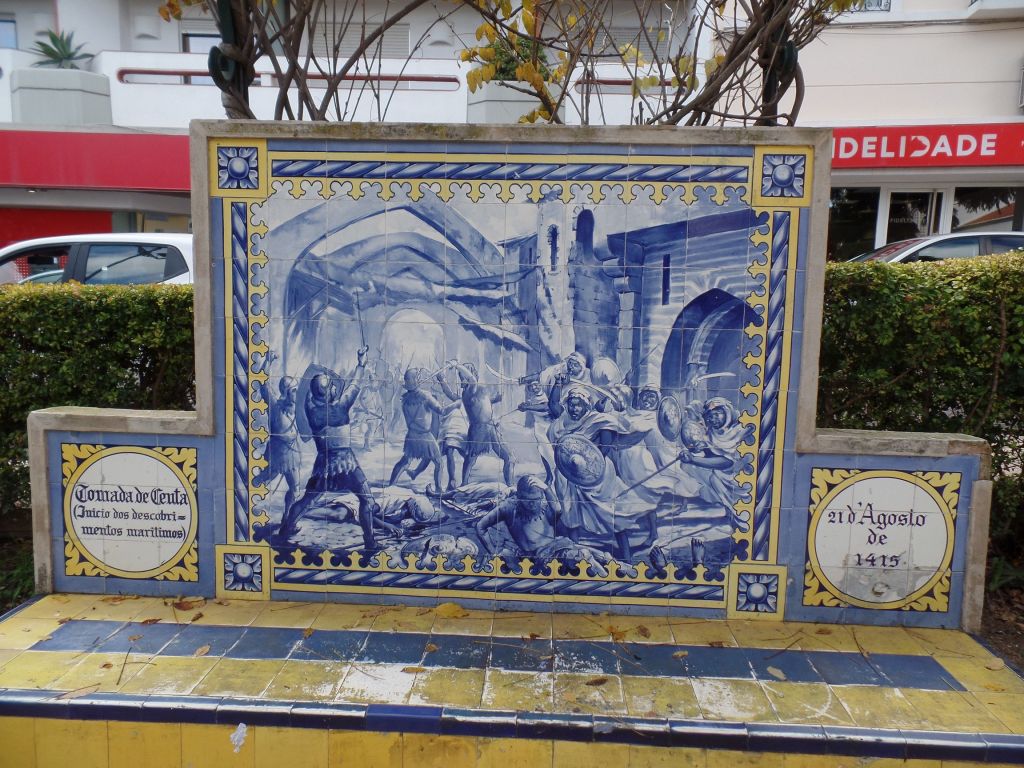 Wir spazierten anschließend eine Weile durch die Altstadt von Portimão und kamen zuerst zum Fonte do Jardim 1 de Dezembro, einem kleinen Park. An den Längsseiten des Parks stehen steinerne Bänke, die mit blau-weißen Fliesenbildern geschmückt sind. Sie stellen die Geschichte Portugals nach, beginnend mit der Unterzeichnung des Vertrages von Zamora am 5. Oktober 1143, in dem das Königreich Kastilien und Léon die Unabhängigkeit des Königreiches Portugal anerkennt. Portugal ist somit der älteste Nationalstaat Europas. 1910 löste die Portugiesische Republik die Monarchie ab. Dargestellt sind ebenso die maurische Besatzung wie auch die portugiesischen Entdeckungsfahrten auf den Meeren.